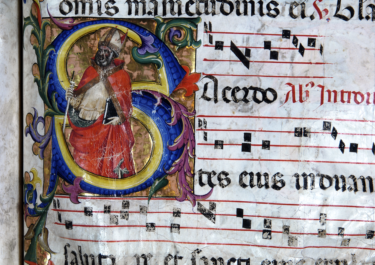 Iniziale fogliata media con figura e caudata S(acerdotes eius), rubr. Alius. Introitus. Corpo della lettera azzurro decorato con foglie verdi, rosa, rosse e lilla che vanno a formare la coda. Sul fondo, sovrapposto al corpo della lettera, è un santo vescovo con il pastorale e il libro in mano