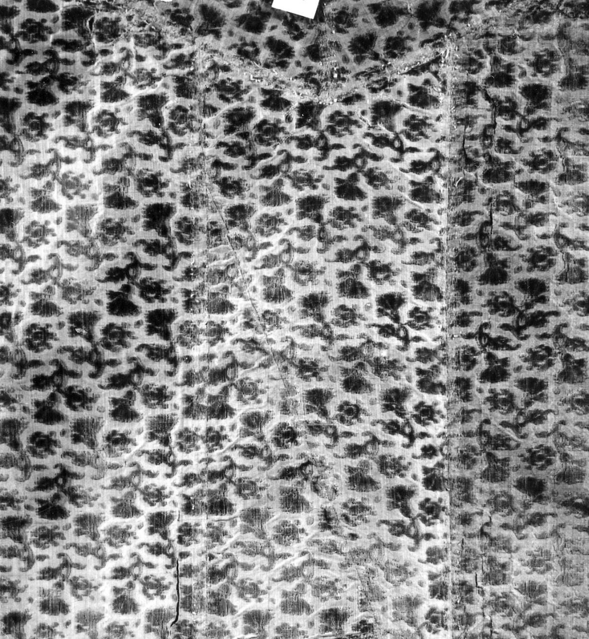 Metà pianeta composta da vari pezzi in velluto cesellato a due corpi. Ordito di fondo in seta celeste, 2 capi, S; ordito di pelo in seta bianca e ocra, più capi. Riduzione 64 filidi fondo circa, 16 di pelo/cm. Trame in set aceleste, 3 capi, STA. Riduzione30 inserzioni/cm. Costruzione: fondo taffettà prodotto da tutti i fili e i colpi di fondo. Opera in velluto riccio (bianco) e tagliato (ocra) creato dall'ordito di pelo stretto fra due trame di fondo. Tessuto con telaio a tiro per velluti, lavorazione diritto sopra. Rapporto disegno cm 7,5x6; campo a ritorno. Motivo a sviluppo orizzontale che si ripete in verticale a scacchiera capovolto. Il modulo prevede uno stelo reciso con foglie, boccio e un dianthus. Fondo celeste, opera in bianco e ocra. Fodera in tela di cotone grezzo