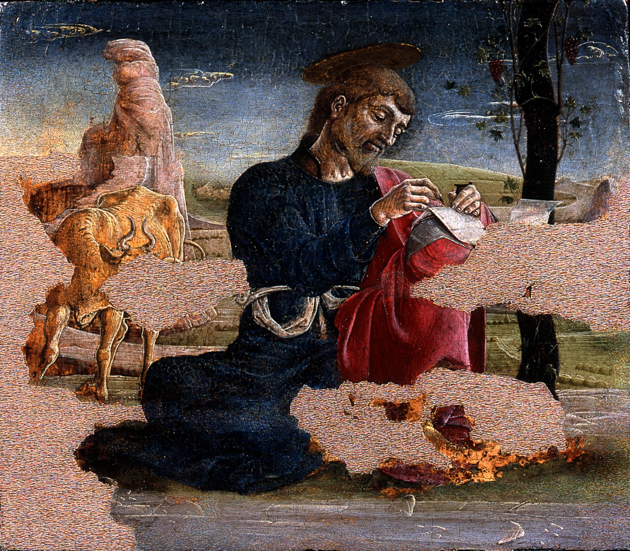 - NOTIZIE STORICO CRITICHE Questa tavola raffigurante 'San Luca evangelista' porta a tergo iscrizioni che l'attribuiscono a Lorenzo Lotto e Cosmè Tura. La seconda delle attribuzioni fu accolta sia da Mina Gregori nel 1986, quando stese un inventario-stima dei beni lasciati dall'ultima erede di Casa Martelli al Seminario Maggiore di Firenze, sia da Alessandra Civai nel suo studio sui 'Dipinti e sculture in casa Martelli (1990)'. Dopo un'accurato restauro presso i laboratori dell'Opificio delle Pietro Dure alla Fortezza da Basso di Firenze, la tavola fu esposta nel 2001 prima a Tokyo e in seguito a Roma, le due sedi della mostra sul Rinascimento in Italia. Nel catalogo della mostra Marco Ciatti del laboratorio di restauro analizzò in maniera dettagliata la tecnica della pittura della tavola, che risulta tagliata su tutti i quattro i lati, e fornì precisazioni sul restauro compiuto. Ciatti analizzò la figura di 'San Luca' anche dal punto di vista stilistico: come egli suggeriva, lo stile pittorico ricorda da vicino quella nella tavoletta di Tura raffigurante la 'Fuga in Egitto' del Metropolitan Museum di New York (cfr. Manca J. 2000, pp. 141-142, n. 26). Suggerì che la tavola Martelli e quella con 'San Giovanni evangelista' conservata nel museo Thyssen-Bornemisza di Madrid (tempera su tavola, cm 27 x 32, cfr. Manca J. 2000, pp. 133-134, n. 20) provenissero dallo stesso polittico. Ipotizzò che questo potesse essere quello già smembrato, ricordato da Girolamo Baruffaldi (1844) nella chiesa parocchiale di San Luca in Borgo fuori Ferrara