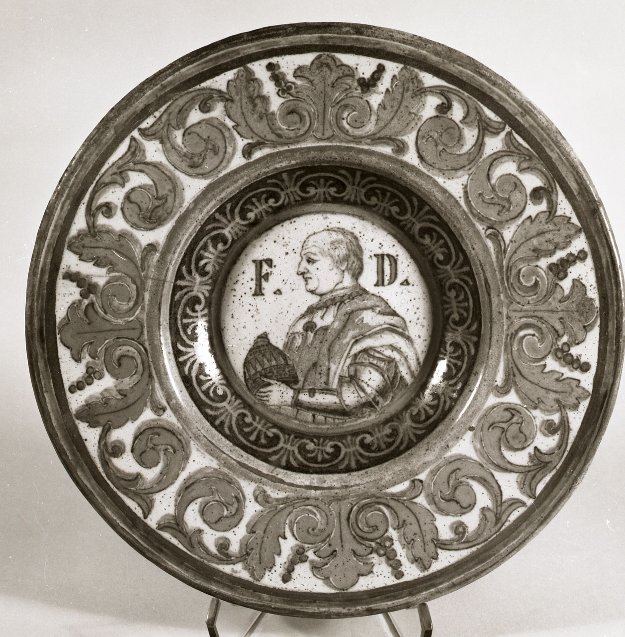 Alzata con larga tesa in maiolica dipinta in blu con lustro rosso e oro, con incavatura centrale e poggiante su piede basso. La tesa è ornata con motivo ripetuto quattro volte di foglie di acanto in campo bianco e tra filetti. La parete del cavetto è con motivo a palmette classiche su manganese. Al centro ritratto a mezza-figura a sinistra, Federico di Montefeltro in armatura col manto e la corona ducale nelle mani. Ai lati, in campo bianco le lettere F. D. .Il verso è smaltato con quattro filetti in lustro rosso