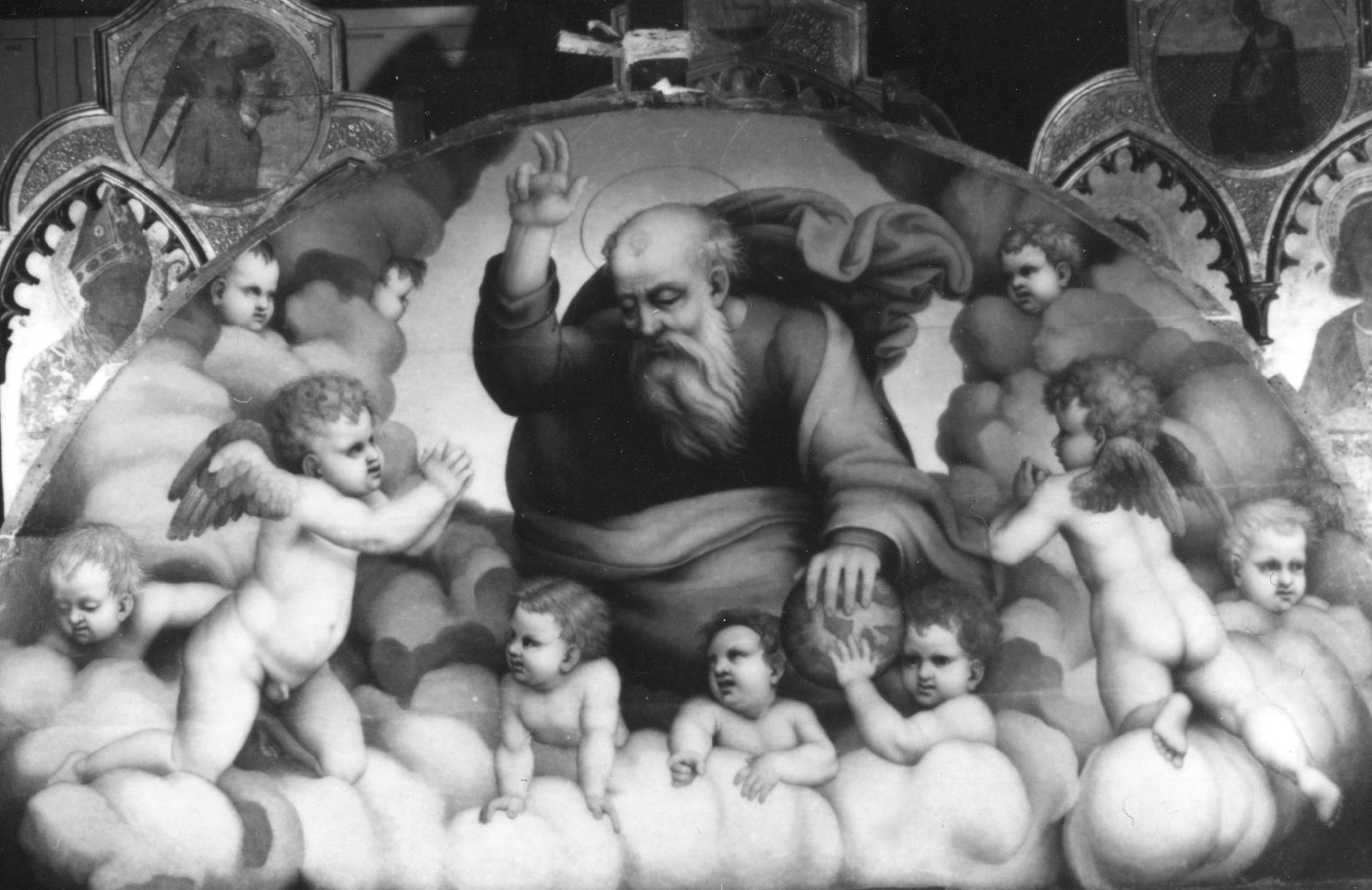 - NOTIZIE STORICO CRITICHE Il Lancisi (sec. XVIII, sec. Metà, p. 119) ricorda la lunetta di Raffaellino Del Colle collocata all'ingresso della sagrestia del Duomo di Sansepolcro. Così anche il Mancini (1832, p. 264) ed il Sacchetti (1876, p. 63; 1888, pp. 5, 79) che la dice un "lavoro squisito e di somma delicatezza". Il Coleschi (1886, p. 168) vide la lunetta già collocata sopra la pala dell' "Assunzione" di Palma il giovane e così anche il Giglioli (1921, p. 9) ed il Ricci (1932, p. 39). In seguito Ricci (1946, p. 53) riporta la notizia che secondo alcuni la lunetta sarebbe stata dipinta da Cherubino Alberti. L'opera è molto vicina nella composizione a quella collocata sopra l'Annunciazione di Città di Castello ed è databile al terzo decennio del XVI secolo (cfr. Sapori, 1974-1975, fig. 19)
