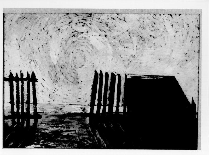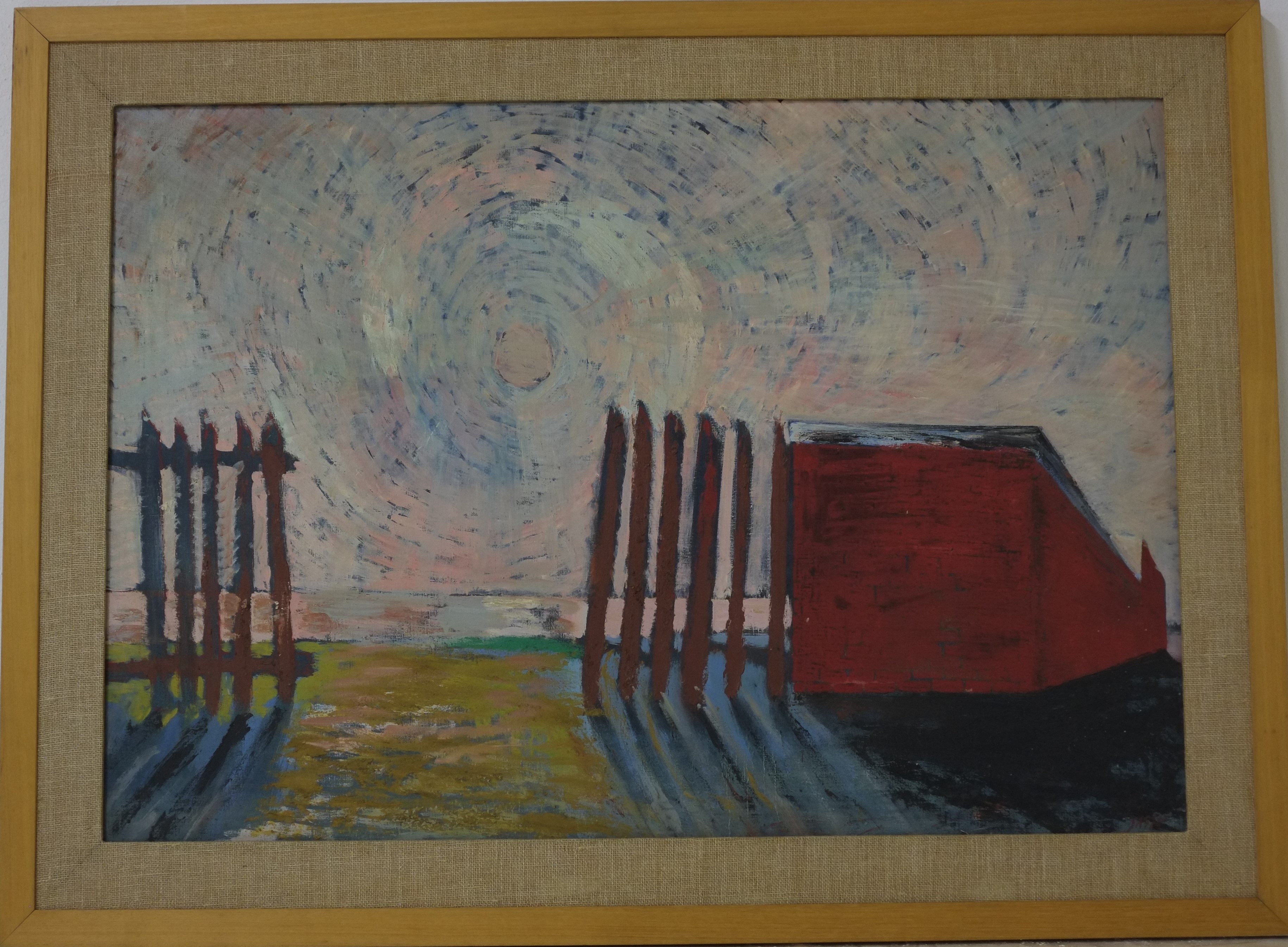 Dipinto ad olio su tela raffigurante uno steccato aperto al centro e addossato ad una costruzione, al di là del quale sta sorgendo il sole. Colori: arancio, azzurro, blu scuro