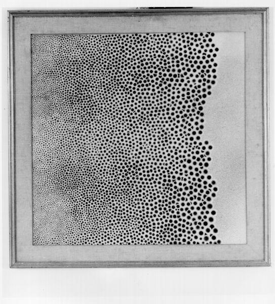 Dipinto ad acrilico su cartone raffigurante una serie di agglomerati circolari, simili a molecole, che dalla sinistra crescono nelle dimensioni verso la destra, per lasciare il margine destro libero. Colori: viola, rosaceo, bianco. Sul telaio: firma, titolo e data