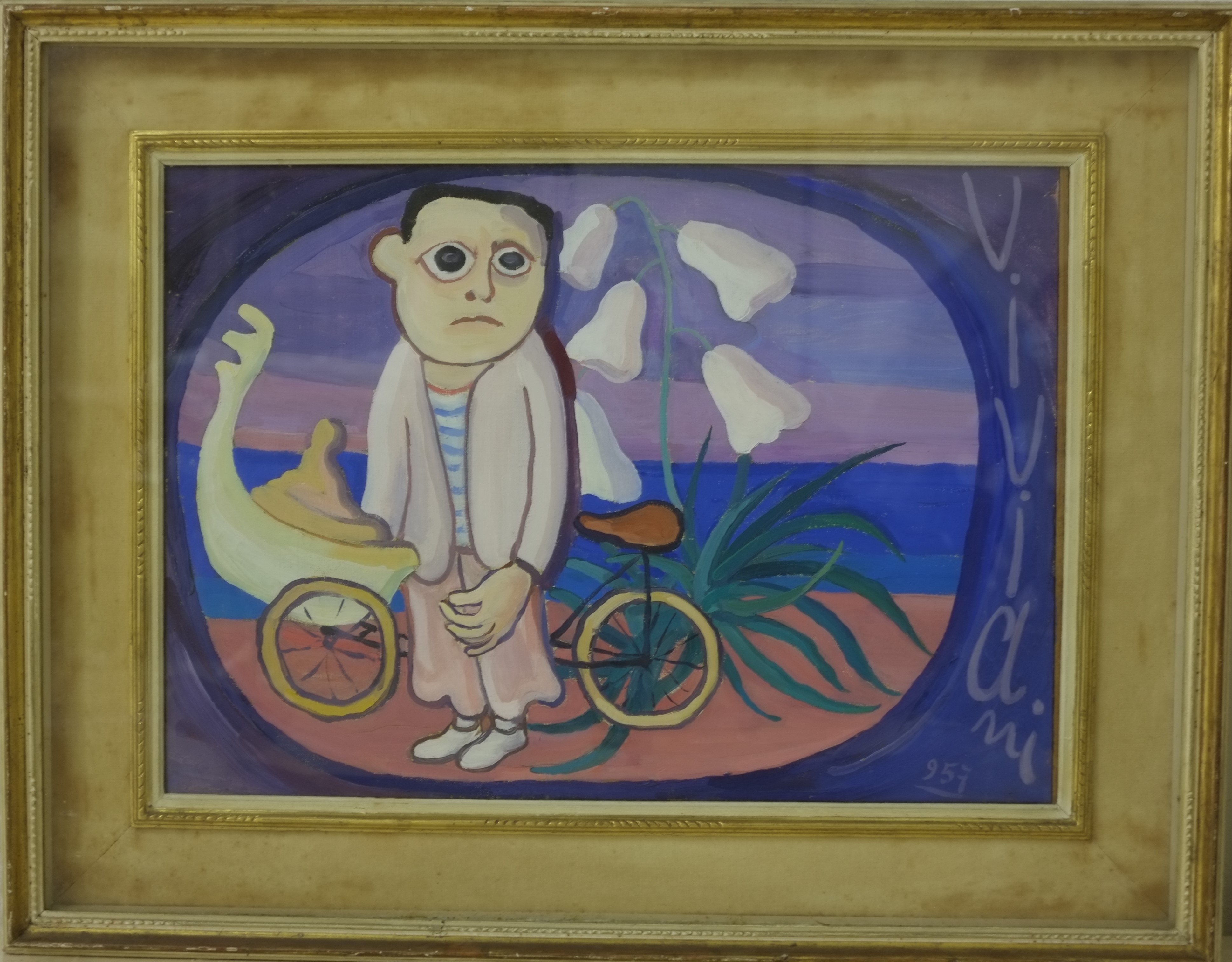 Dipinto ad olio su tela raffigurante in un fondo viola un ovale entro cui sta un gelataio con il suo carrettino, dei fiori e dietro il mare. Colori: viola, rosa, verde. Firma e data sul lato sinistro