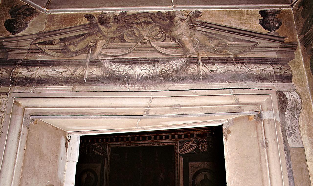 - NOTIZIE STORICO CRITICHE Il fregio a monocromo con effetto "trompe l'oeil" che inquadra la porta d'accesso alla sala di Leone X, speculare a quello intorno all'affresco dello Stradano con i "fuochi di San Giovanni", è riferito all'attività di Marco da Faenza. Per il Cecchi si tratta dell'intervento conclusivo l'intera decorazione della "scala grande" in relazione all'esecuzione del dipinto dello Stradano già ultimato plausibilmente il 24 giugno 1558, festività del Santo Patrono di Firenze, in cui furono completati diversi ambienti del quartiere di Leone X, come ricorda il Vasari in una lettera al duca Cosimo