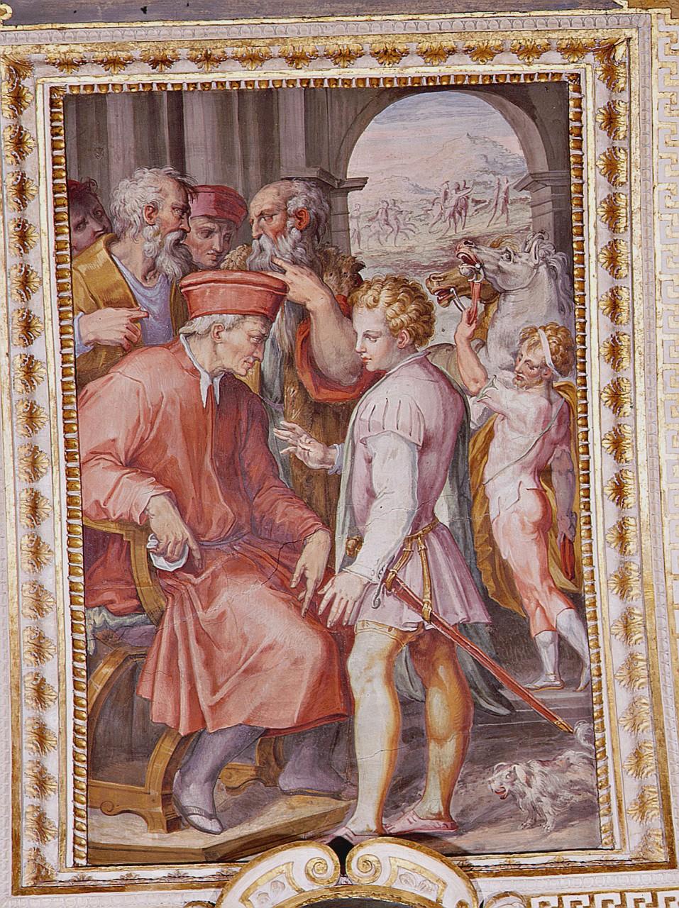 - NOTIZIE STORICO CRITICHE La scena, descritta dal Vasari nei "Ragionamenti", illustra l'episodio in cui Cosimo, svelando al giovane Santi la sua discendenza dai Bentivoglio. lo convince a recarsi a Bologna e a prendere il governo della città. L'aretino riporta inoltre che l'effige di Santi "si ritrasse dalla medaglia sua di mano di Michelozzo scultore"