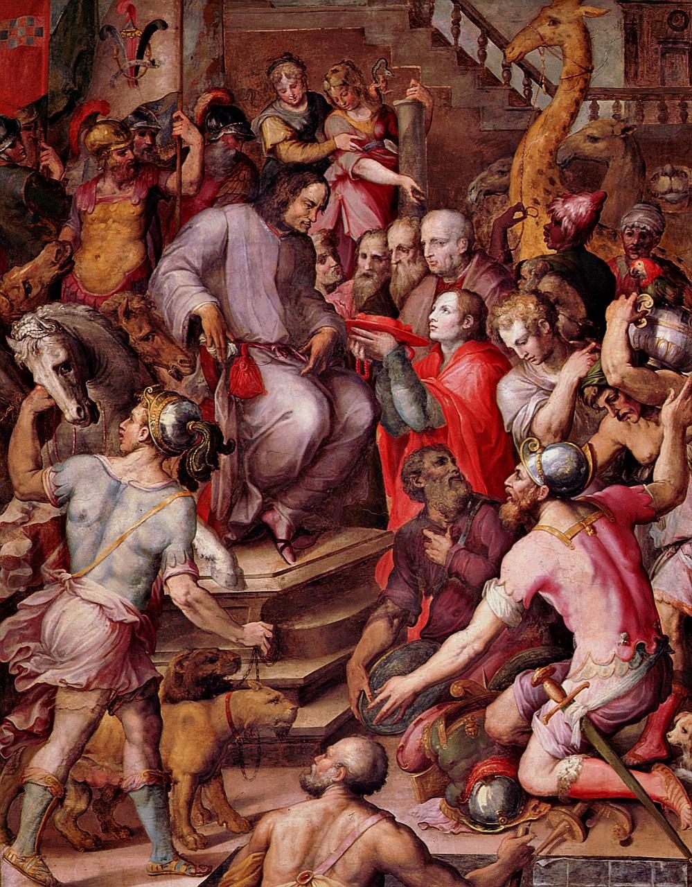 Soggetti profani. Personaggi: Lorenzo il Magnifico; Niccolò Viteli; Braccio Baglioni da Perugia. Figure maschili: astanti; guerrieri; ambasciatori. Allegorie-simboli: Prudenza; Fortezza. Abbigliamento: all'antica. Abbigliamento: classico: elmi; corazze romane. Abbigliamento: contemporaneo: tuniche; mantelli; galero; scarsella. Attributi: (prudenza) serpente; colonna; (fortezza) pelle di leone. Paesaggi: cielo; edifici. Architetture: gradinata; balconata; colonne; edificio timpanato. Oggetti: armi; armature; foglio di carta; catene; collari; vasi; vessilli con emblemi. Animali: leoni; cane; pappagallo; giraffa; cammeli
