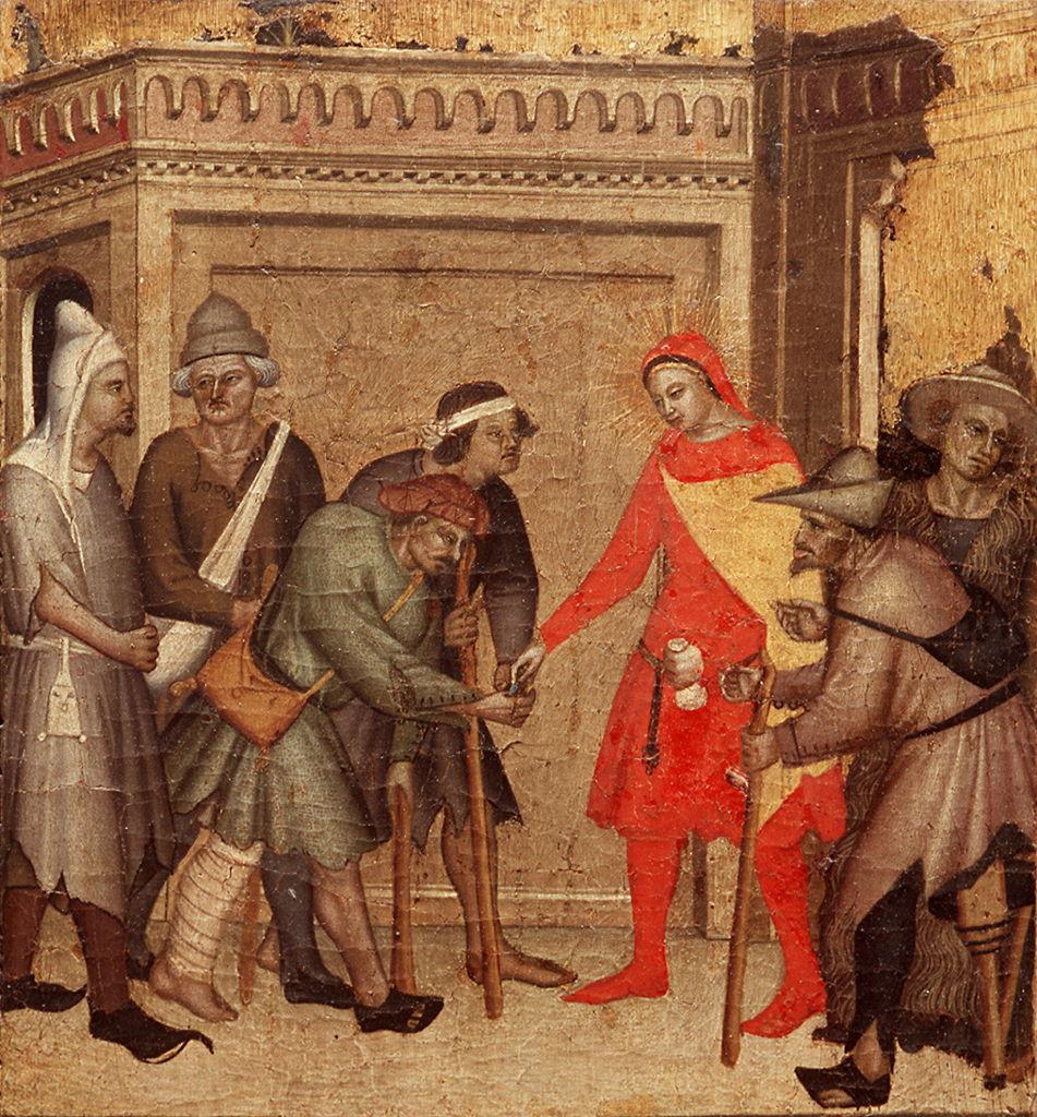 - NOTIZIE STORICO CRITICHE Non conosciamo la provenienza di questo piccolo dipinto, che compare citato per la prima volta nell'inventario del 1881 e che fu esposto alla Galleria degli Uffizi almeno dal 1891. E' probabile, come nota la Marcucci, che il dipinto facesse parte di un'opera più grande, con la figura del santo al centro e le storiette laterali, secondo una tipologia frequentemente adottata in area toscana e fiorentina fin dal Duecento. Procacci riferì la tavoletta a scuola toscana delll'ultimo quarto del XIV secolo; si deve ad Antal il primo riferimento ad un pittore "vicino al Maestro della cappella Rinuccini". Tuttavia è la Marcucci che l'attribuisce decisamente a questo maestro che completò il ciclo di affreschi di Giovanni da Milano nella cappella Rinuccini in S.Croce. La studiosa proponeva una datazione poco dopo il 1370. L'attribuzione è accettata dal Boskovits, dal Fremantle e dal Bellosi che nel 1973 identificava il Maestro della cappella Rinuccini con Matteo di Pacino. La datazione è quella suggerita dalla Marcucci, sia in base alle affinità che lei nota con lo stile di Jacopo di Cione negli anni dopo il 1370, sia per la pratica pittorica matura già volgente verso l'effetto gotico della scenetta di genere