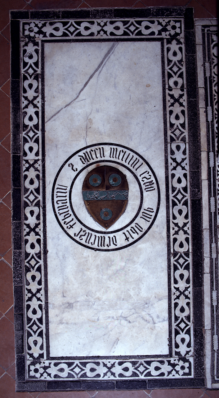 - NOTIZIE STORICO CRITICHE La cornice è identica a quella della lastra di famiglia Portigiani. Tuttavia l'iscrizione in caratteri gotici rende la lastra stilisticamente antecedente rispetto alla lastra Portigiani contraddistinta dai caratteri capitali con le "grazie" (cfr. scheda 09/00283322). Secondo il sepoltuario Rosselli chiudeva l'iscrizione la data 1397. Né la lastra né la sepoltura compaiono tuttavia nel sepoltuario del 1439. Se la notizia riportata dal Rosselli è vera, dunque, si tratterebe di uno di quei casi, frequenti nel Quattrocento, in cui sulla lastra veniva riportato il nome dell'avo fondatore del ramo della casata, nel caso in questione morto nel 1397 e fatto traslare probabilmente dalla sepoltura originaria in quella acquistata dagli eredi. I motivi decorativi della lastra sono tipicamente quattrocenteschi