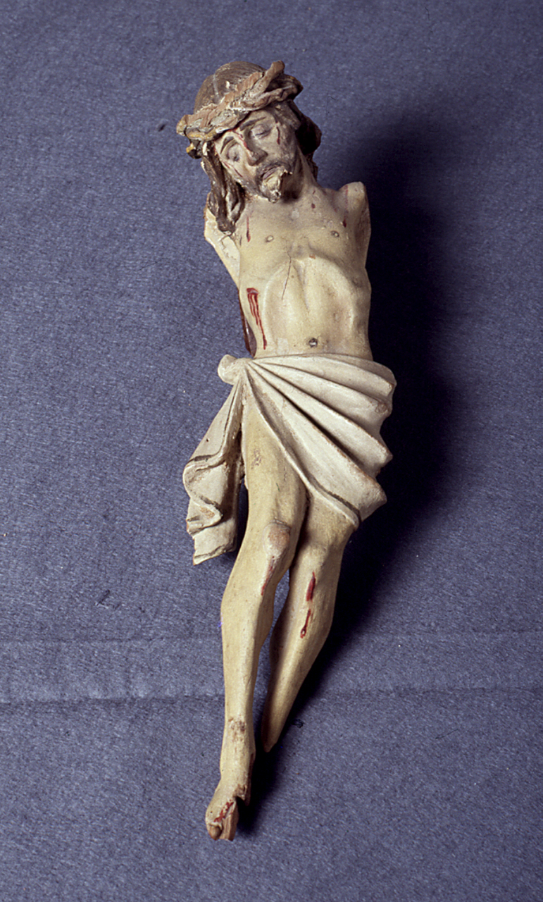 - NOTIZIE STORICO CRITICHE Del frammento di Cristo crocifisso non si ha alcuna notizia documentaria. Dai confronti che si possono istituire con il repertorio proposto dalla Lisner, la datazione sembra orientarsi, almeno tipologicamente, fra la fine del Trecento e l'inizio del Quattrocento. La qualità piuttosto scadente e il mediocre stato di conservazione non consentono però ulteriori precisazioni