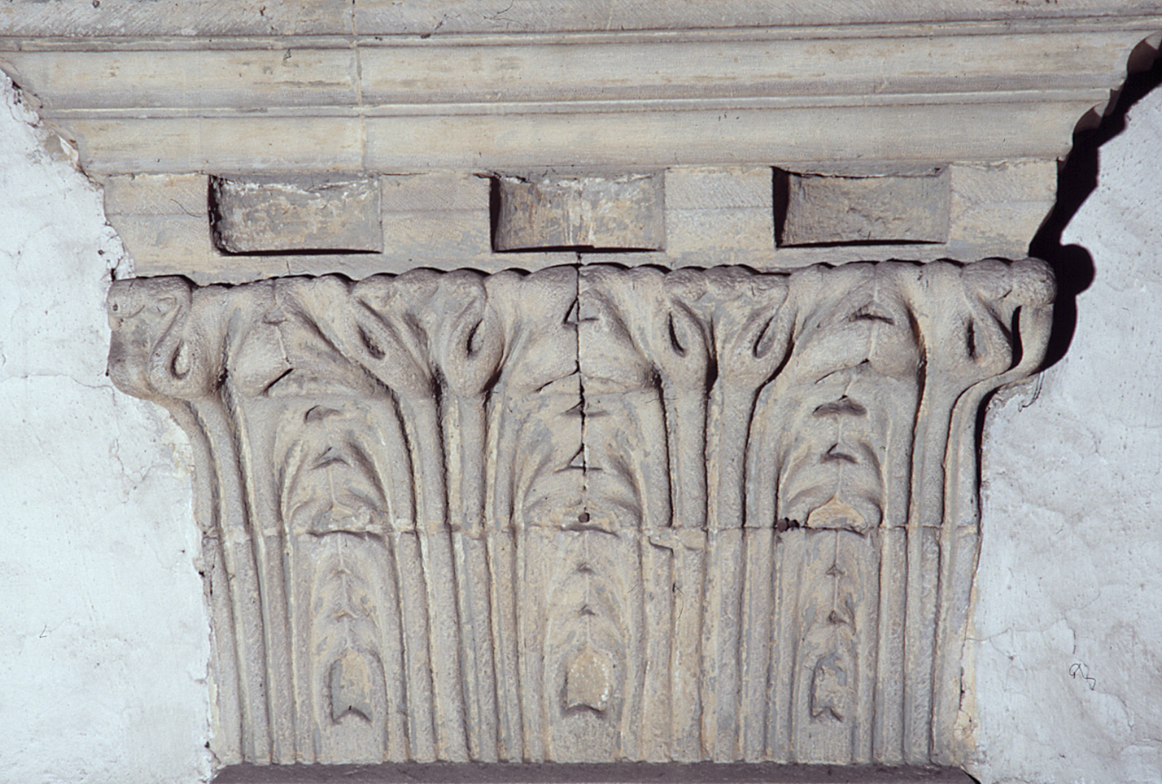 - NOTIZIE STORICO CRITICHE Il peduccio e' stato eseguito dopo il 1314, data a cui il Conti fa risalire la demolizione della vecchia chiesa di S. Croce che arrivava a questa altezza, e prima del 1341, data riportata su una delle travi del tetto che si trova leggermente piu' ad ovest rispetto a questo peduccio. Infatti, come fa notare il Conti, il tetto della basilica, costruita procedendo da est a ovest, venne realizzato man mano che si innalzavano le campate