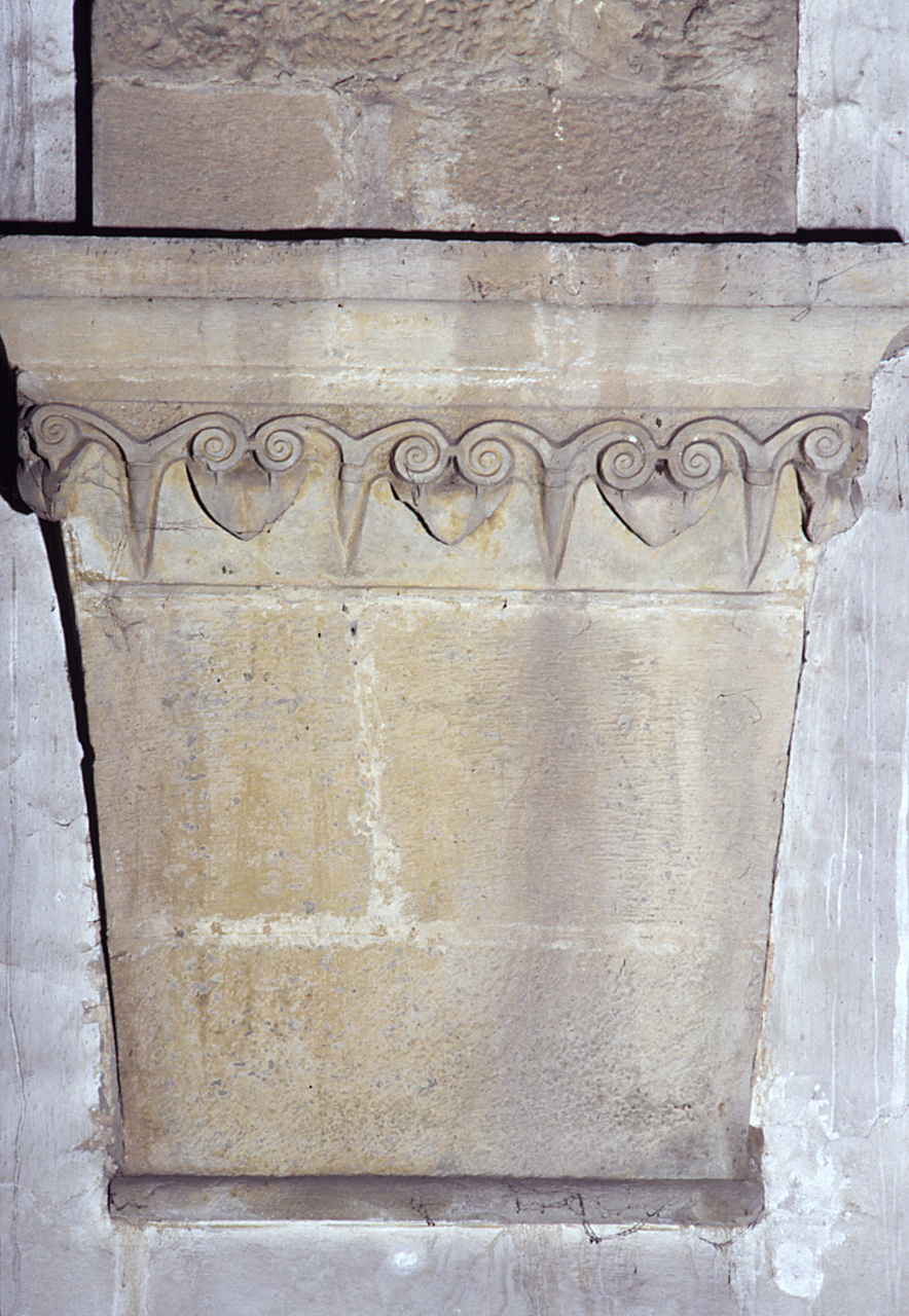 - NOTIZIE STORICO CRITICHE Come hanno chiarito i Paatz e poi il Conti la basilica e' stata costruita partendo dal transetto verso la facciata. Questo peduccio, pertanto, e' stato eseguito ad un livello avanzato dei lavori e senz'altro dopo la meta' del secolo XIV. La fabbrica infatti era ancora alla quinta campata nel 1341, data scritta su una delle travi del tetto che, come dimostra il Conti, venne costruito contemporaneamente alle campate