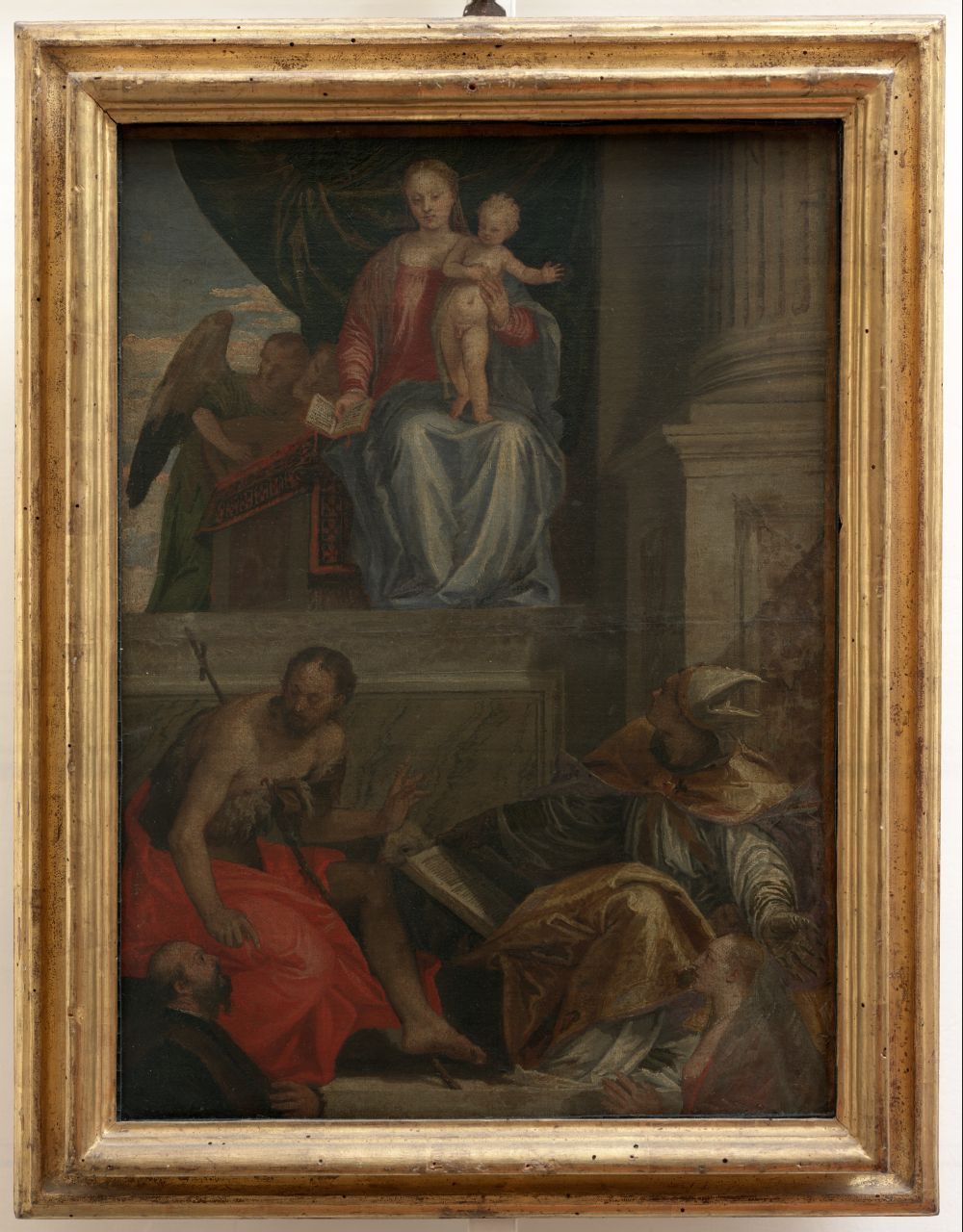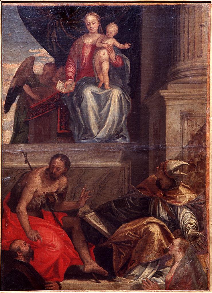 - NOTIZIE STORICO CRITICHE Il dipinto è stato variamente considerato bozzetto della pala Bevilacqua Lazise e copia della stessa. Rispetto alla pala che ha subito pesanti restauri nell'Ottocento, la tela degli Uffizi riporta la versione intensa, evidente soprattutto nella figura del Battista.Paolucci non ha escluso l'autografia del dipinto fiorentino che mostra in effetti una qualità pittorica piuttosto alta e una maggior aderenza, rispetto alla pala veronese, al disegno preparatorio di Chatsworth (collezione duca di Devonswhire,n. 287). Tale opinione trova concordi la Gisolfi Pechukas e il Rearick e più di recente Pignatti-Pedrocco