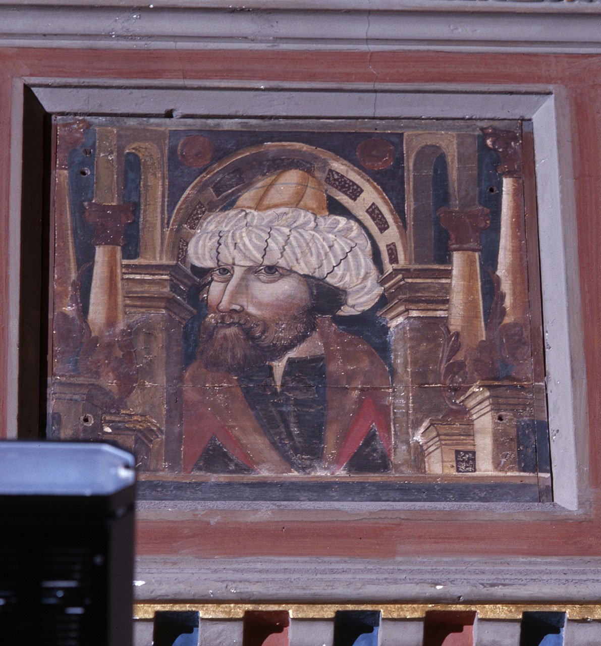 Soggetti profani. Figure maschili: uomo. Abbigliamento: giubba con pelliccia; turbante. Architetture: arco a lacunari; arcatelle; basamenti; colonne. Decorazioni: borchie; foglie d'acanto