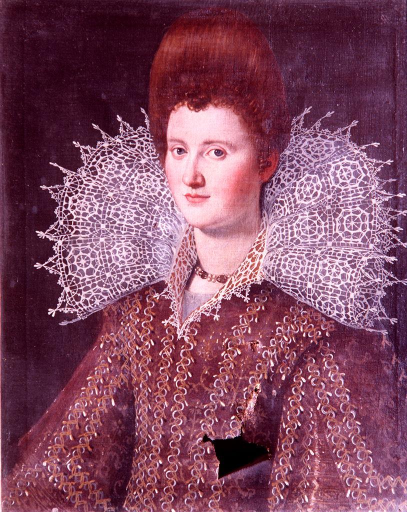 - NOTIZIE STORICO CRITICHE Il dipinto fa parte della serie detta della Bellezze di Artimino (cfr. L.B ertani Bigalli in Gli Uffizi Catalogo Generale, 1980, II, pp. 710 e sg.; M .Chappel, 1988, pp. 56-64), costituita da ritratti di gentildonne pervenu ti in doppia versione, al 'petto' e al 'gomito' (una delle due versioni er a probabilmente destinata alle ritratte e alle loro famiglie). La serie, v oluta forse da Cristina di Lorena per ornare i saloni della Villa di Artim ino, fu iniziata alla fine del secolo XVI e terminata entro il 1638. Il nu cleo principale (quarantaquattro ritratti) è databile comunque entro il 16 06. Dai documenti pubblicati dal Chappel si ricava che una prima serie di ventitré ritratti fu pagata nel 1601 e una seconda di ventuno tra il 1603 e il 1606. In alcuni pagamenti della seconda serie, certamente copia della prima, compare il nome di Achille di Baldassarri Granre, pittore della bo ttega di Jacopo Ligozzi, attivo come ritrattista per i Medici. Dai documen ti si deduce che sono probabilmente suoi i ritratti di Settimia Magalotti, Maria Pucci, Ludovica Antinori Falconetti, Maddalena Strozzi Bardi, Costa nza di Lioni Ricci, dei quali sono conservati solo gli ultimi due. Non pot endo però stabilire con certezza quale sia la serie originale e quale la c opia (anche se è più probabile che la versione originale sia quella al gom ito) non si può determinare quali ritratti abbia eseguito il Granre. Per q uanto riguarda i dipinti documentati nel 1601, il Chappel fa il nome di Ma tteo Confortini, pittore noto per pagamenti di ritratti non meglio precisa ti, attivo negli anni fra il 1585 e il 1633. Ma in una lettera del 28 magg io 1600 al Granduca Ferdinando I (ASF, Mediceo 5962, c. 523), Cristina di Lorena nomina come artista scelto per l'esecuzione della serie un certo 'Z oppo pittore', che potrebbe essere Francesco Mati, citato dal Gabburri pro prio come 'Zoppo' e che era allievo di Alessandro Allori. A parte l'identi ficazione dei nomi, nella serie sono individuabili, secondo la Meloni, due mani, una più antiquata e rigida nei ritratti delle dame col doppio collo di merletti, e una più moderna nei ritratti delle donne con il colletto p iù rigonfio e con gli orecchini a grappolo d'uva. Nel 1676, trentasei tele sono registrate nell'Inventario generale della Guardaroba (ASF, Guardarob a 741) e poco dopo trenta (le stesse?) entrarono in galleria (AGF, Giornal etto di Galleria, ms 62, c. 128,7, gennaio 1678). In data imprecisata i di pinti giunsero al Poggio Imperiale, dove furono inventariati nel 1836. Alc uni ritratti, tornati agli Uffizi, furono nuovamente rinventariati nel 189 0. Altre tele mantengono invece soltanto il numero del Poggio Imperiale, d ove ancora sono conservati dieci dipinti. Il ritratto di Morella Borgherin i è così descritto nell'Inventario della Villa del Poggio Imperiale del 18 60:"un quadro in tela [...] nel quale vi è dipinto il busto della Morelli. .."