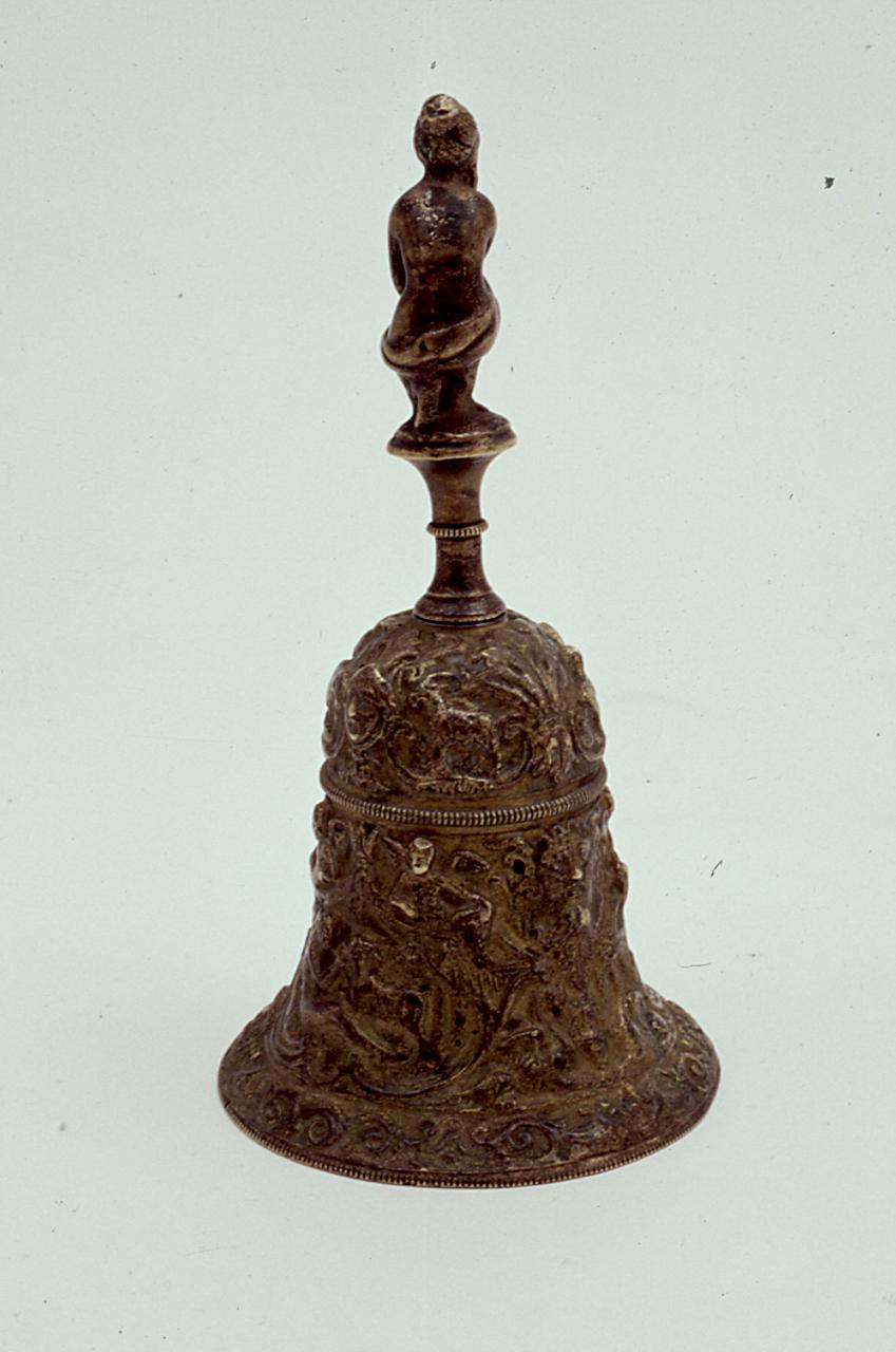 - NOTIZIE STORICO CRITICHE L'oggetto rientra nella produzione rinascimentale dei campanelli da tavola dovuta all'attività di scultori italiani specializzati nella esecuzione di piccoli oggetti. Per Carla Milloschi (1987) si tratterebbe di un'opera di produzione fiorentina per la profusione di motivi decorativi a grottesca e per elementi stilistici desunti dalla cultura fiorentina. La statuetta, nell'impugnatura , potrebbe essere una derivazione dalla "Venere accovacciata" del Giambologna. Un confronto convincente è il campanello da tavolo del Kunstgewerbemuseum di Berlino, probabile copia più tarda di una campana del Cellini andata perduta. A parte alcune diversità nelle figure, i particolari decorativi sono identici tanto da far pensare alla presenza di un calco originario da cui sono state tratte copie più tarde. La Milloschi non esclude però che il campanello possa essere una copia ottocentesca dell'originale berlinese