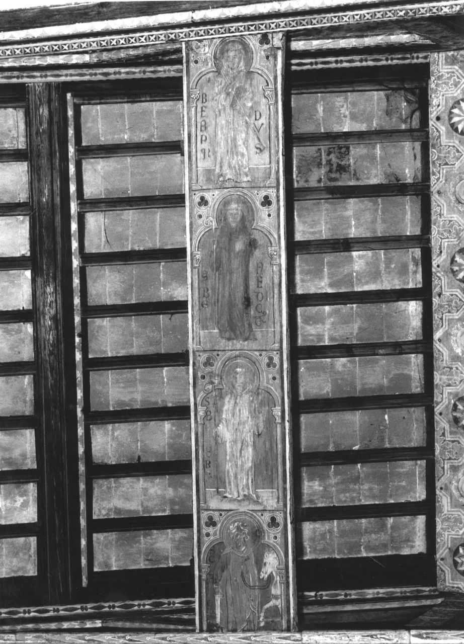L'asse presenta i bordi decorati da bande di colore bianco e rosso e la raffigurazione di quattro edicole trilobate sorrette da colonne che racchiudono rispettivamente la figura di un santo