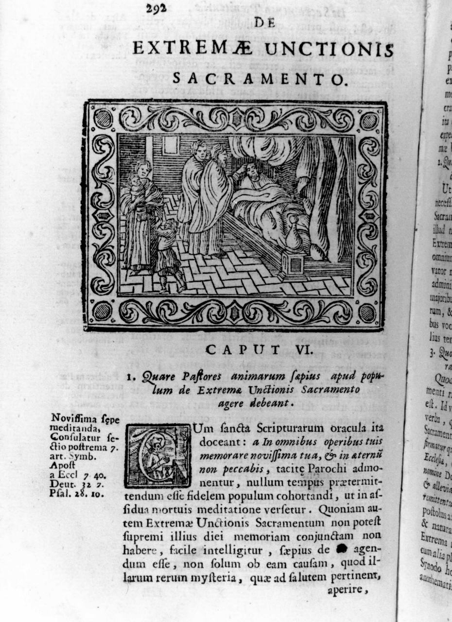 Ecclesiastici: officianti. Figure. Mobilia: letto. Elementi architettonici. Abbigliamento: religioso