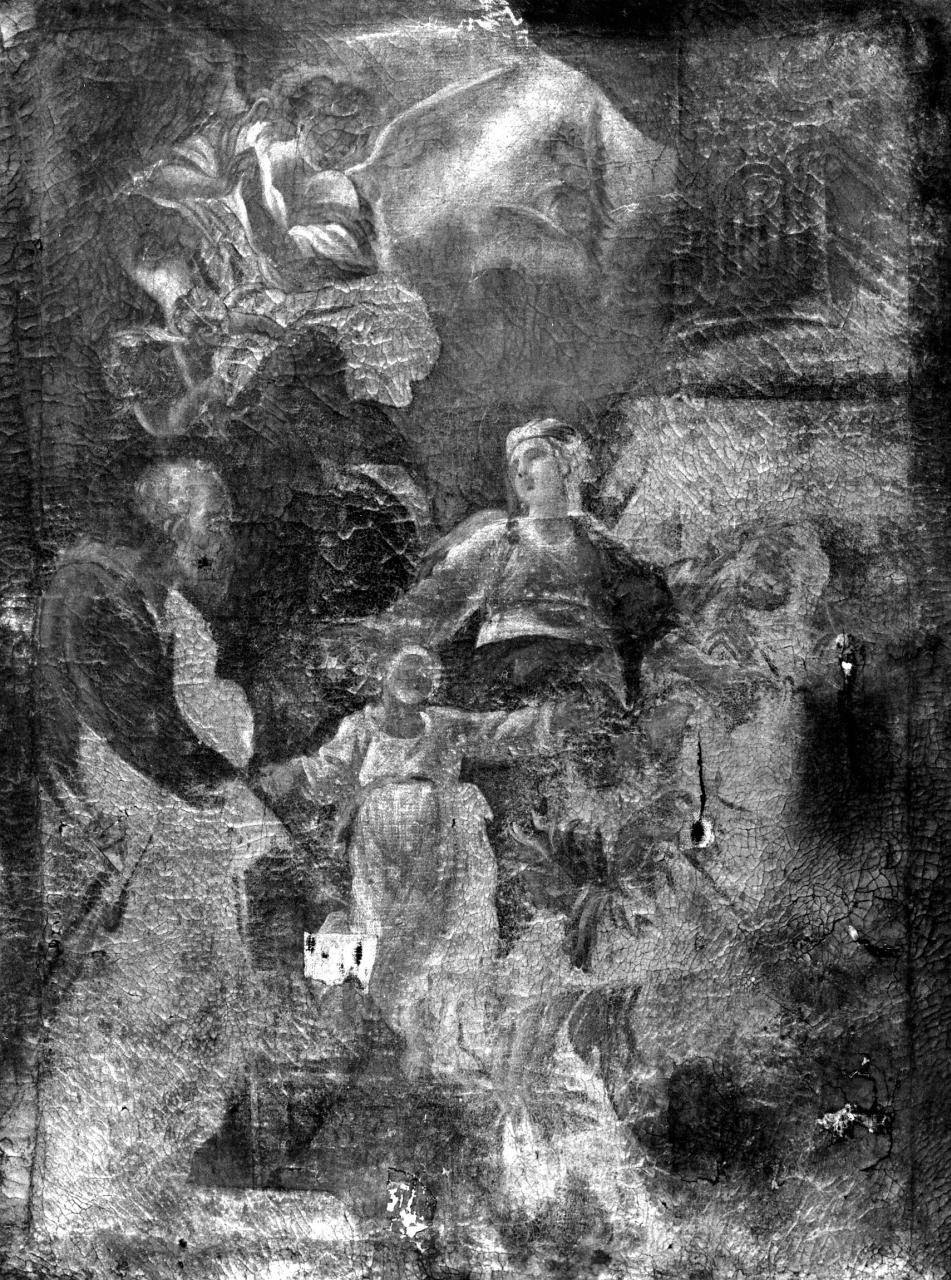 - NOTIZIE STORICO CRITICHE Il dipinto, quasi illeggibile per il cattivo stato di conservazione, fu eseguito in pendant con altre tre tele raffiguranti episodi di cristo per lo più in rapporto con San Giuseppe e la Madonna (cfr. schede OA nn. 0900300476, 0900300478-79). I dipinti hanno uguali misure e rivelano un'identità di mano. Essi sono forse identificabili fra quelli definiti genericamente quadri in tela "rappresentanti vari Santi" con cornici di legno menzionati in chiesa nell'inventario del 1784-87 (cfr. Archivio di Stato di Prato, resti del Patrimonio Ecclesiastico, n. 27, fasc. 16). Meno sicuro ma probabile è inoltre il legame con altri due dipinti della pieve raffiguranti la "Madonna del Carmelo" e la "Adorazione del SS.Sacramento" (cfr. schede OA nn. 0900300481-82),di simili misure. Essi presentano numerose affinità stilistiche tali da suggerire lo stesso autore anche se la diversità di conservazione dei due gruppi rende difficile il confronto. Il nostro quadro si configura come opera piuttosto modesta di un artista fiorentino o pratese attivo nella prima metà del Settecento come mostrano la conduzione sciolta e frantumata dei panneggi e le tipologie delle figure. Esso riveste interesse soprattutto in quanto si rivela copia di un più famoso dipinto di Camillo Sagrestani, documentatoci da un bozzetto oggi consevato nella Collezione Longhi di Firenze, databile al terzo decennio del Settecento. Oltre all'identità della composizione il nostro pittore ripropone anche i tipi del Sagrestani come si vede soprattutto dalle proporzioni slanciate e dai volti rotondi colti in scorcio e tenta di restituirne il contrastato chiaroscuro e la pittura di macchia. Se il bozzetto della Collezione Longhi è quindi un importante termine post quem per datare il quadro di Iolo, dubbi permangono sulla corretta identificazione iconografica della scena, in particolare sulle due figure di Santi che si aggiungono alla Sacra Famiglia