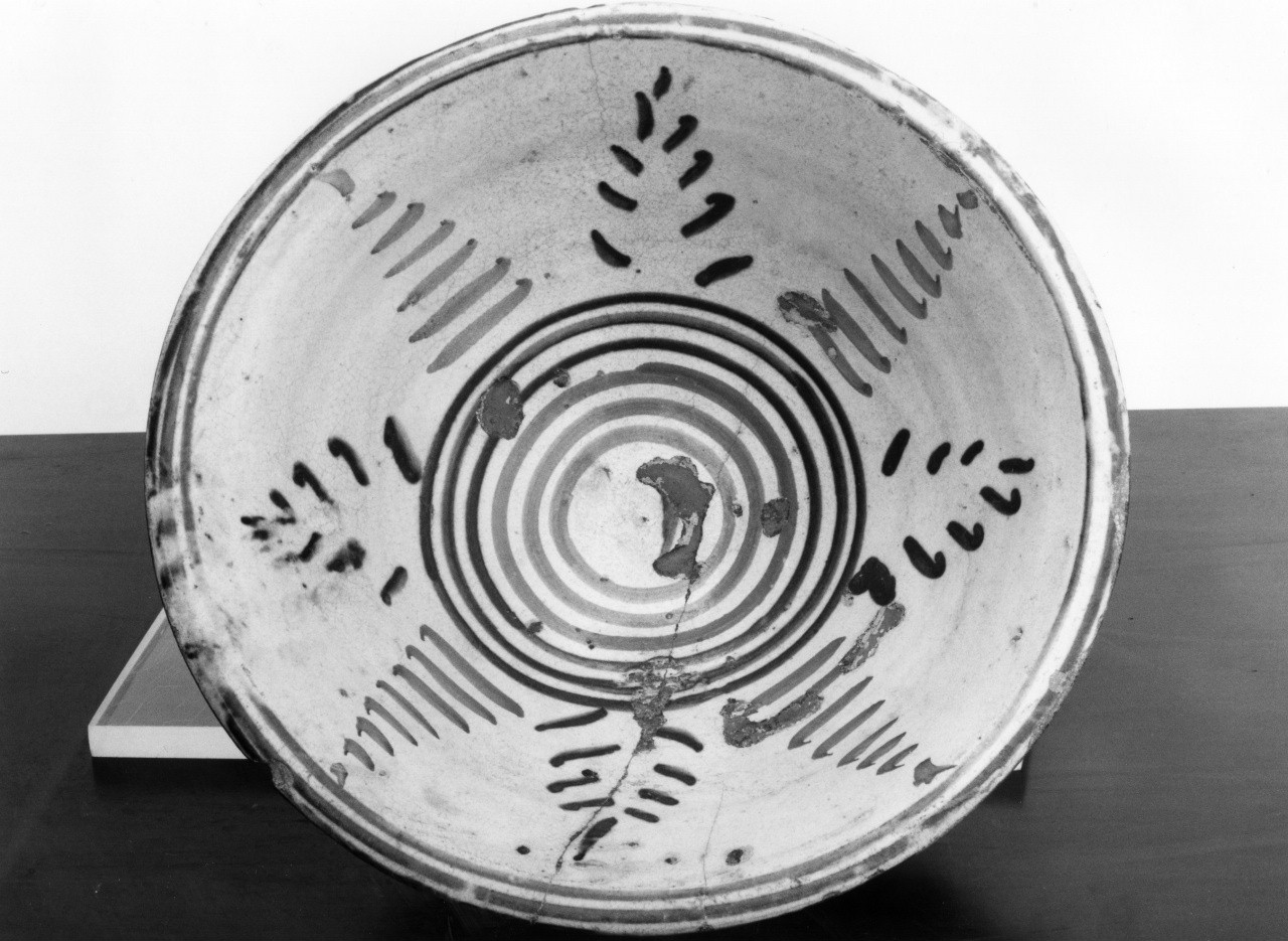 Ha forma rotonda e decorazione a mano libera in ocra e verde ramina su fondo avorio: filettature nel bordo e al centro; gruppi di pennellate decrescenti distribuite lungo le pareti interne