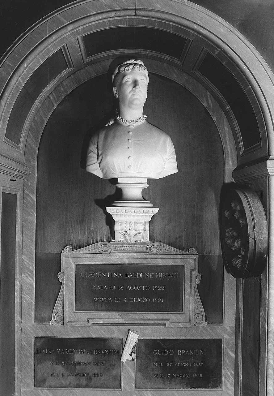 Monumento sepolcrale costituito da una lastra rettangolare con il margine superiore decorato con due volute e motivi fitomorfi a spiga. Sopra la lastra è una mensola architettonica decorata con volute di foglie d'acanto sulla quale è un piedistallo circolare che sostiene il busto del defunto. Sulla lastra è l'iscrizione sepolcrale