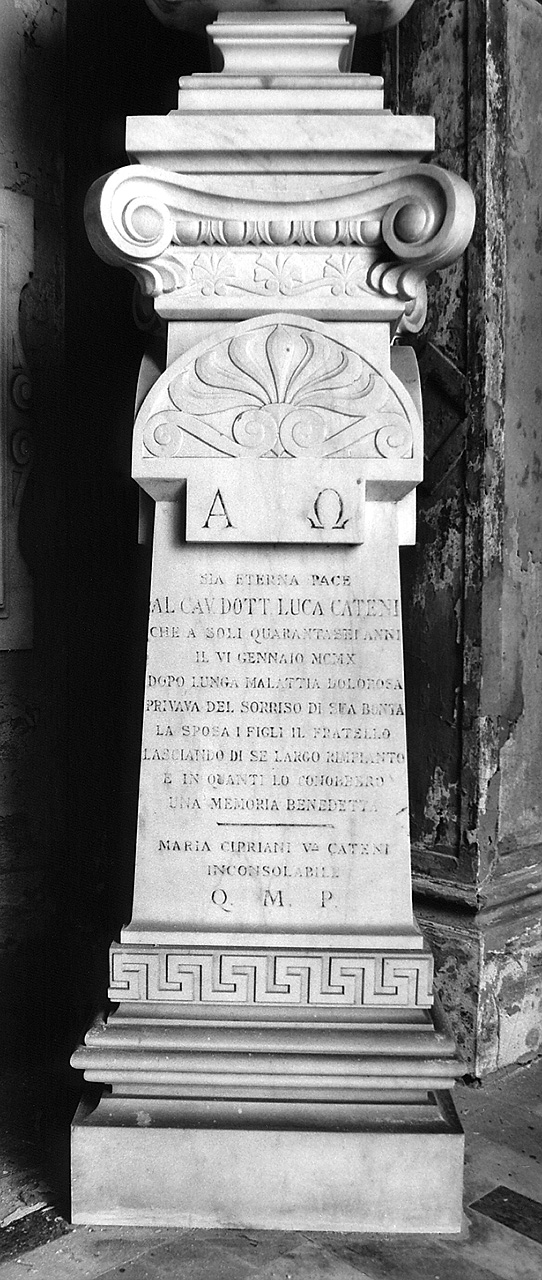 - ISCRIZIONI sul cippo - A(LFA) O(MEGA)/ SIA ETERNA PACE/ AL CAV. DOTT. LUCA CATENI/ CHE A SOLI QUARANTASEI ANNI/ IL VI GENNAIO MCMX/ DOPO LUNGA MALATTIA DOLOROSA/ PRIVAVA DEL SORRISO DI SUA BONTÀ/ LA SPOSA I FIGLI IL FRATELLO/ LASCIANDO DI SE LARGO RIMPIANTO/ E IN QUANTI LO CONOBBERO/ UNA MEMORIA BENEDETTA/ MARIA CIPRIANI V(EDOVA) CATENI/ INCONSOLABILE/ Q. M. P - lettere capitali - a incisione -
