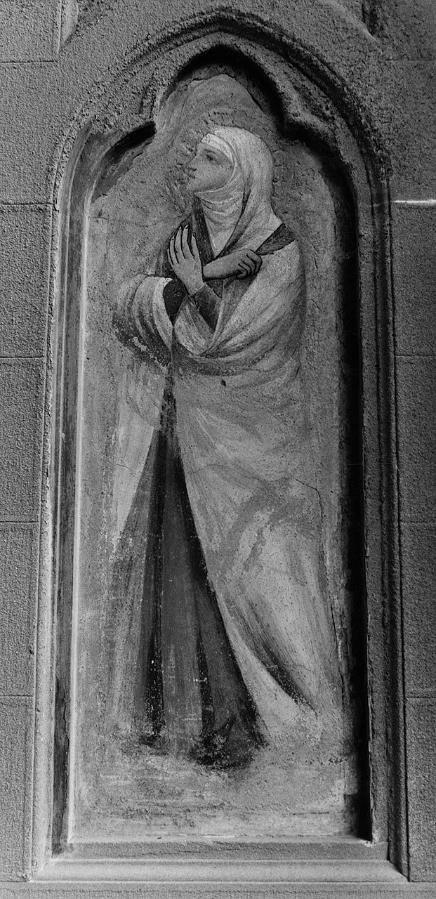 - NOTIZIE STORICO CRITICHE I due affreschi sul lato destro e sinistro dell'interno del portale vennero eseguiti come tutta la decorazione della cappella Stibbert tra il 1883 ed il 1885 (cfr. Registro dei Pagamenti, 1884-1885). LA cappella fu fatta costruire ed arredare dal collezionista e studioso d'armi e costumi Frederick Stibbert (1838-1906) in seguito alla morte della madre, Giulia Cafaggi vedova Stibbert, nel 1883. La decorazione pittorica fu affidata al pittore, decoratore e restauratore fiorentino Gaetano Bianchi, che negli stessi anni era impegnato ad affrescare con stemmi e motivi decorativi neogotici le sale della villa-museo di Stibbert a Montughi. Le due figure "neogiottesche" affrescate dal Bianchi nella cappella Stibbert sono un tipico esempio della vasta produzione di decorazioni in stile medievale e neoquattrocentesco che il pittore, ben noto anche per le sue ricerche storiche ed i suoi allestimenti in ambienti pubblici e privati (Giannini C., 1992; Baldry F, John Temple Leader e il Castello di Vincigliata: un episodio di restauro e di collezionismo nella Firenze di secondo Ottocento, Tesi in museografia, Università degli Studi di Firenze, A. acc. 1992/93) ha lasciato in chiese, palazzi e ville fiorentine restaurati o ricostruiti nella seconda metà del sec. XIX. Le qualità di frescante del Bianchi si erano formate direttamente sulle opere degli antichi da lui studiati e restaurati e le sue decorazioni (ricordo i lavori al Bargello,nel castello di Vincigliata, nel castello di Fosdinovo in Lunigiana, nel transetto di Santa Croce) mostrano il progressivo formarsi di uno stile che, sebbene secondo la prassi romantica attingesse ecletticamente a più modelli, poteva solo essere fiorentino: descrittivo, narrativo, di grande forza disegnativa e tonale. Intorno al 1883 il pittore lavorava a Fosdinovo e nella cappella Salutati del Duomo di Fiesole. La santa raffigurata potrebbe essere identificabile con Santa Giulia, monaca agostiniana o vallombrosana (Kaftal G., Iconography of the Saints in Tuscan Painting, Sansoni, Florence, pp. 590-591) in onore della defunta