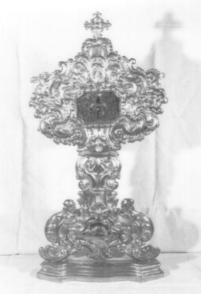Base a volute fitomorfe includenti cartella, fusto sopra basemento architettonico, mostra a cartella rettangolare ad andamento trasversale, teca rettangolare mistilinea. Decorazione della mostra è data da fitto intreccio di volute includenti valve e recanti ai lati due tralci di fiori rivolti verso l'alto e verso il basso. Teca, con cornice a ovoli, sormontata da cespo d'acanto sorreggente crocetta fitomorfa. Sul fusto e sulla cartella della base due valve. Esp.: Le botteghe degli argentieri lucchesi del XVIII secolo, Lucca, 1981, n° 109 di cat. Bibl.: Le botteghe degli argentieri lucchesi del XVIII secolo, Firenze, 1981, p.126