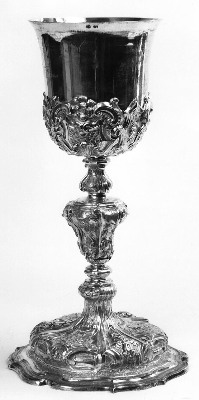 - NOTIZIE STORICO CRITICHE I punzoni presenti nella coppa indicano l'epoca ed il luogo di esecuzione dell'oggetto. Il marchio con le iniziali RAC (Revenda Camera Apostolica) veniva impresso dal bollatore della zecca dello Stato Pontificio per i lavori di lega inferiori alla bontà del "carlino". Restò in vigore dal mese di luglio 1734 allo stesso periodo del 1744. Questo bollo veniva affiancato da un punzone numerale, in cifre arabe, per indicare in bajocchi la quantità di argento contenuta nella lega di metallo. Nel calice è presente il n. 80, che corrisponde a 734 millesimi