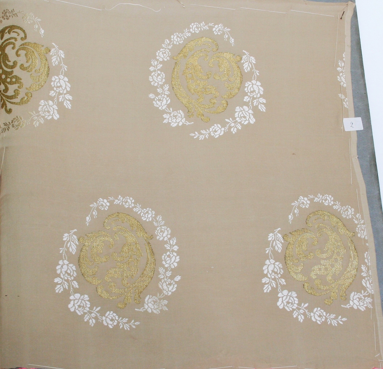 Pezza di tessuto in seta tinta beige (armatura raso) operata per effetto di trame liseré e broccate in oro filato: motivi fitomorfi dorati con volute, inseriti all'interno di ghirlande con rose a monocromo; disposizione a scacchiera. Riscontrata cimosa: cm 0.8, armatura gros de Tours