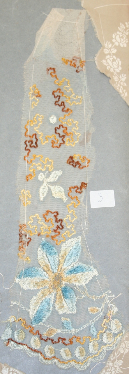 Frammento di balza in tulle meccanico (Bobbinet) in filato di cotone, ricamato in sete policrome: orlo inferiore festonato con decoro perlinato, e grande infiorescenza sui toni del celeste accompagnata da piccole foglie sparse; fondo con decoro ad effetto vermicelles (ricamo meccanico, Cornely e Schiffly)