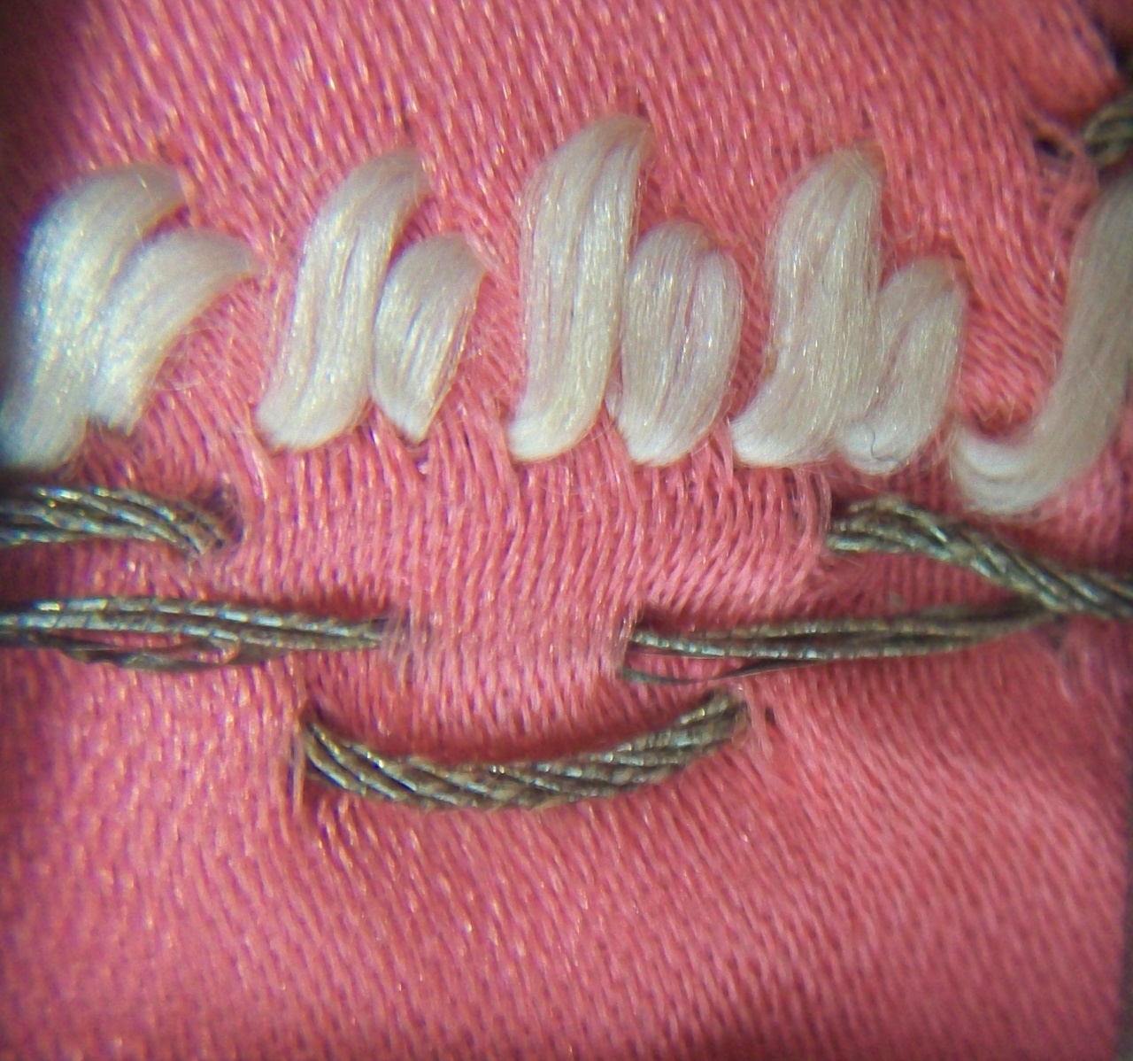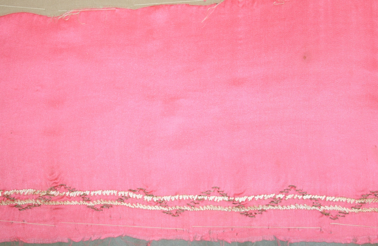 Tessuto in seta color rosa acceso (ad armatura raso) ricamato lungo l'orlo inferiore con motivo di doppio nastro intrecciato, in seta avorio non ritorta, argento lamellare e riant, su anima in filato tinta écru (punti passato, diritto orizzontale lavorato in diagonale)