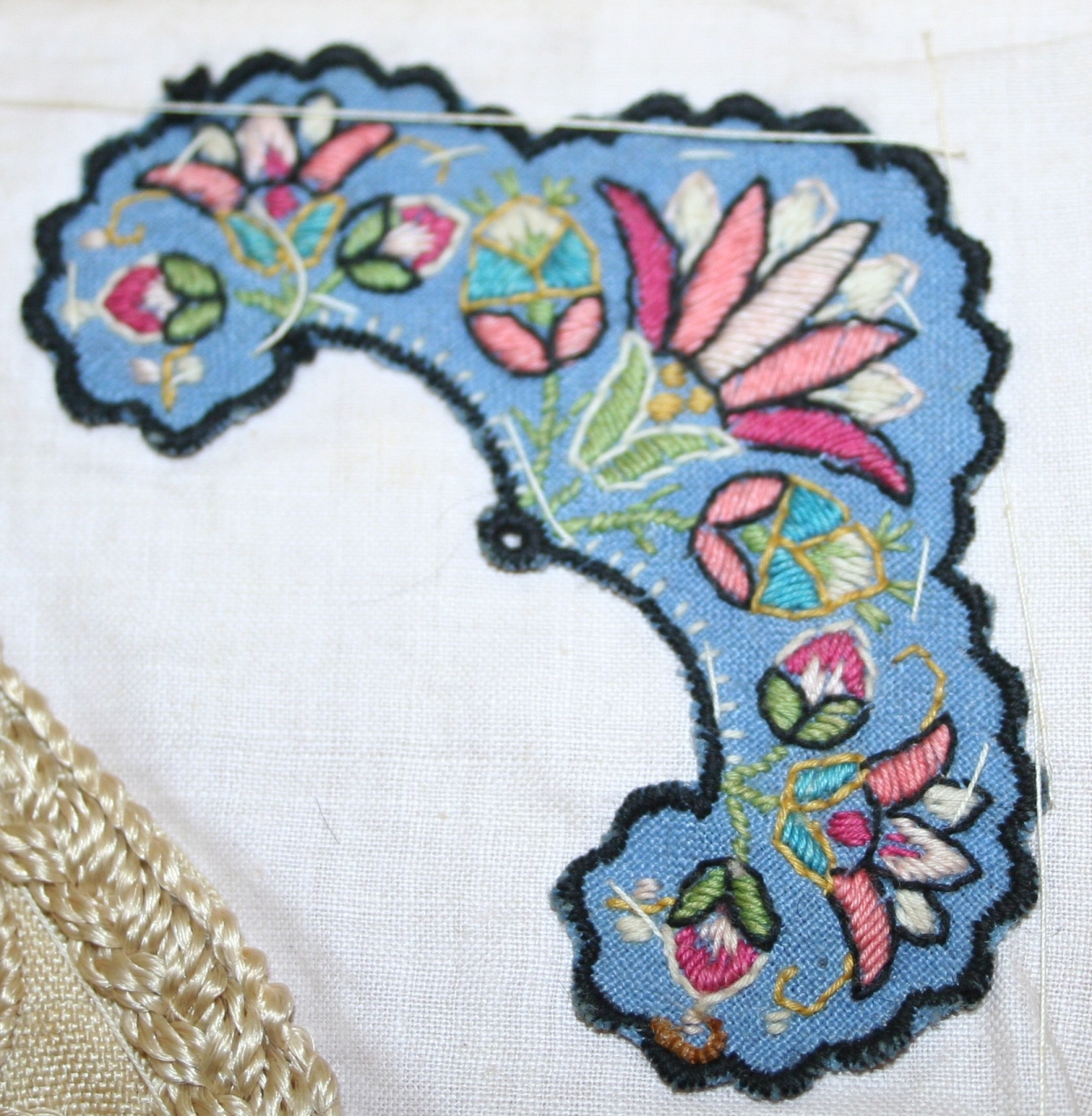 Applicazione sagomata in tela di cotone celeste, ricamata meccanicamente (macchina da ricamo manuale) in filati di cotone policromi, con composizione a minuti motivi floreali sviluppati simmetricamente