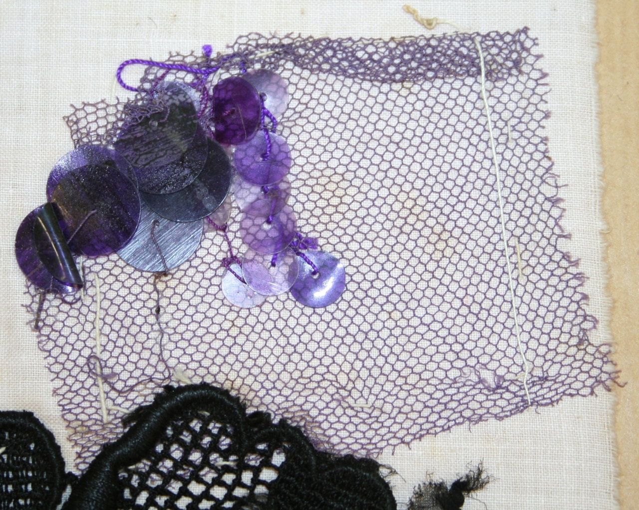 Frammento di tulle meccanico (Bobbinet) di seta viola, con applicazione di paillettes circolari viola, in tre diversi formati (gelatina di bue o gommalacca)