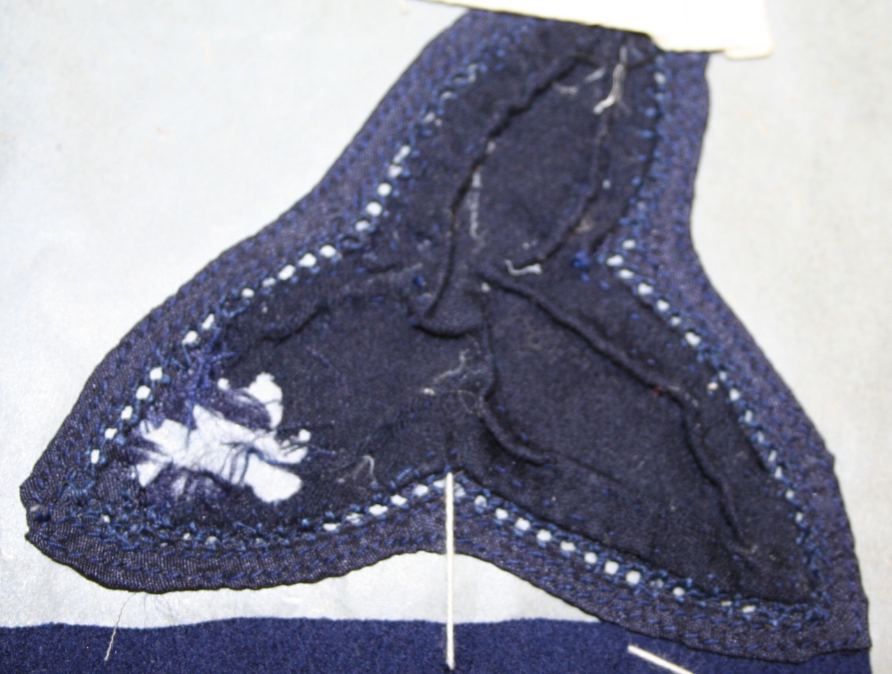 Guarnizione per abito in panno di lana blu scuro, a forma di foglia trilobata con nervature in rilievo, fermate a punto filza; orlo esterno rifinito à jour e profilato da nastrino in taffetas di seta nel medesimo colore