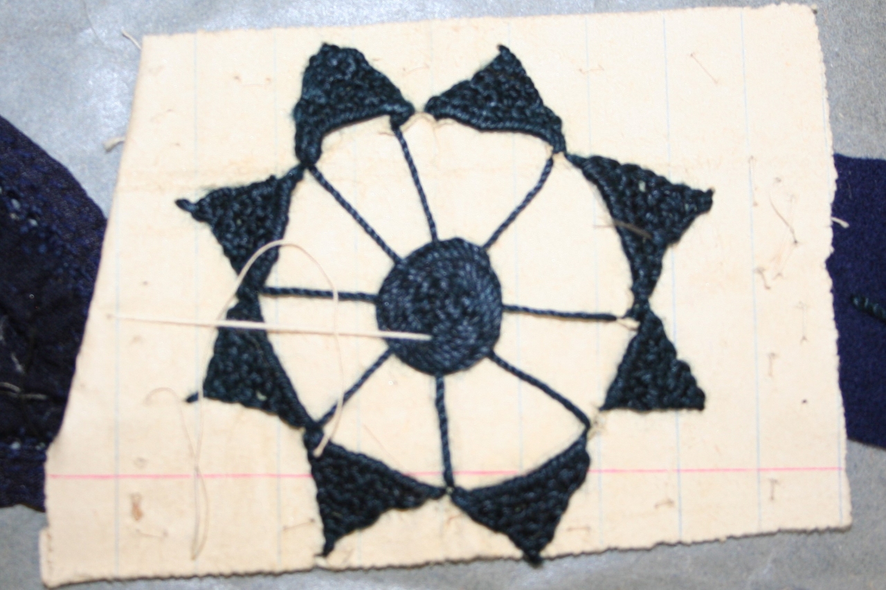 Merletto ad ago su supporto in carta (pagina di quaderno a righe), realizzato in filato di cotone blu scuro: forma geometrica circolare, con occhiello raggiato centrale e punte triangolari lungo la circonferenza (a punto festone rinforzato)