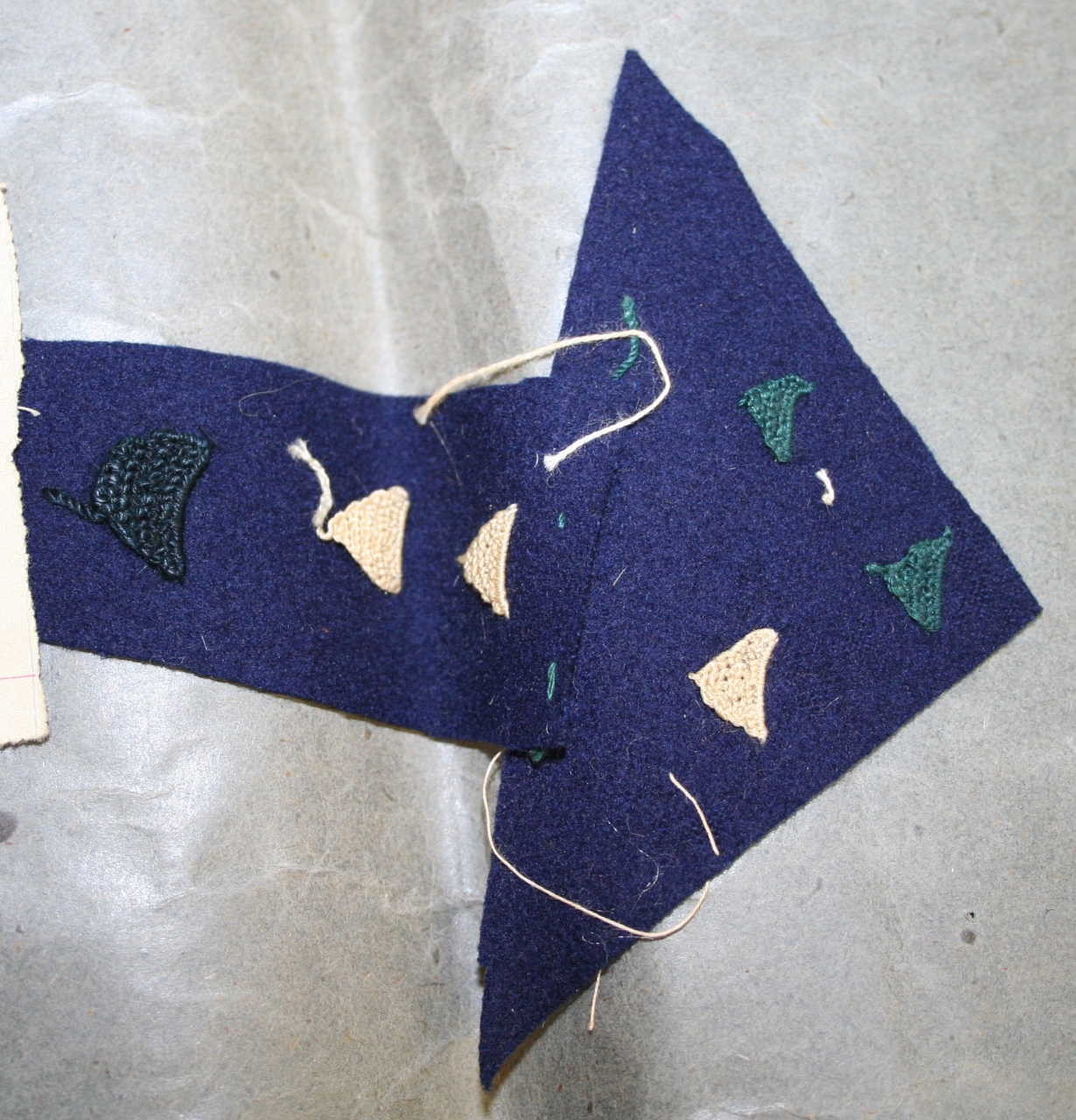 Panno di lana blu scuro, sagomato a forma di freccia con applicazioni triangolari ad ago, in filati di cotone nei colori avorio, nero e verde scuro (lavorazione a punto festone ed occhiello rinforzati)