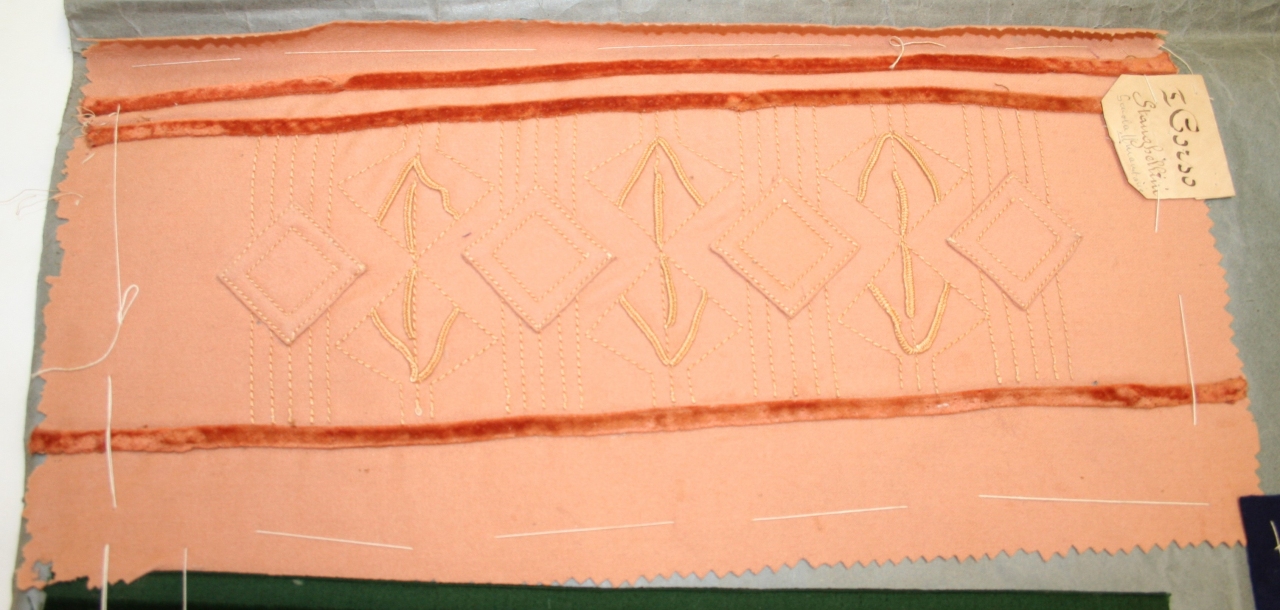 Studio per ricamo in applicazione, con motivi geometrici e a losanghe inseriti entro incorniciatura lineare orizzontale (costituita da borlotti in velluto color mattone); realizzato su panno di lana rosa carne, mediante riporto di tasselli nel medesimo materiale, opportunamente sagomati e cuciti a macchina (con filato di seta in tinta); barrette decorative in filato di seta rosa carne, lavorato a punto festone rinforzato