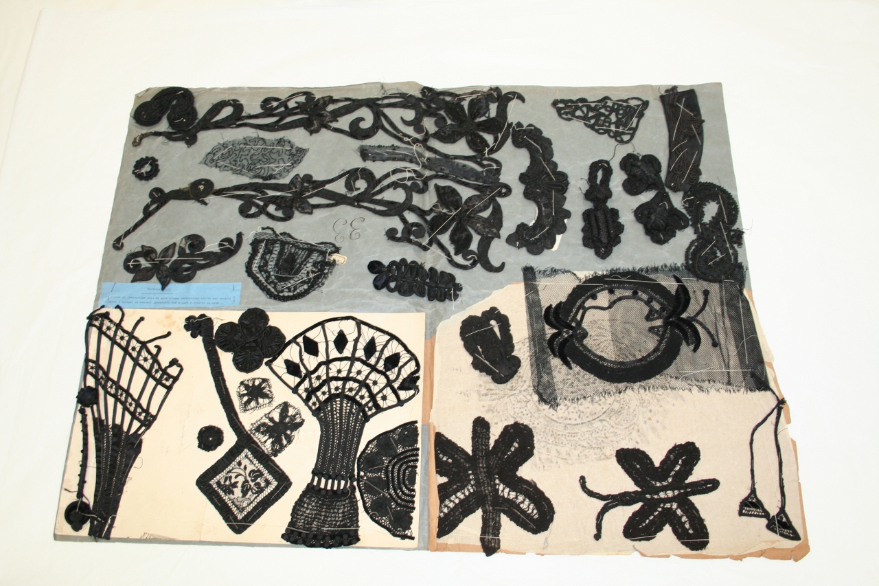 Cartella/campionario di formato rettangolare in cartoncino grigio. Contiene numerosi frammenti di merletto, ricami e guarnizioni per abito femminile, di colore nero