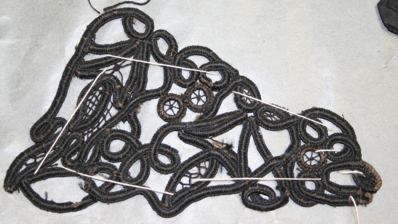 Applicazione per abito femminile costituita da cordoncino in cotone marrone rivestito da filato in seta nera, opportunamente ripiegato e disposto a formare elementi a voluta e di ispirazione fitomorfa; riempitivi ad ago in filato di cotone nero, con occhielli tridimensionali rifiniti a punto occhiello imbottito, e campiture a punto incrociato o a fondo rete con maglie quadre annodate