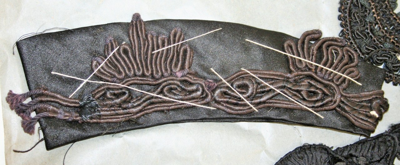 Ricamo in applicazione realizzato su raso di seta nero (striscia di tessuto sagomata: giro-manica o orlo manica?), con teoria di fiori stilizzati realizzati mediante riporto (manuale) di soutaches con anima in cotone nero opportunamente ripiegati, rivestiti in filato di seta non ritorto, di colore nero e marrone scuro