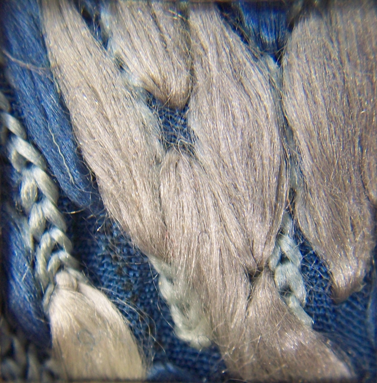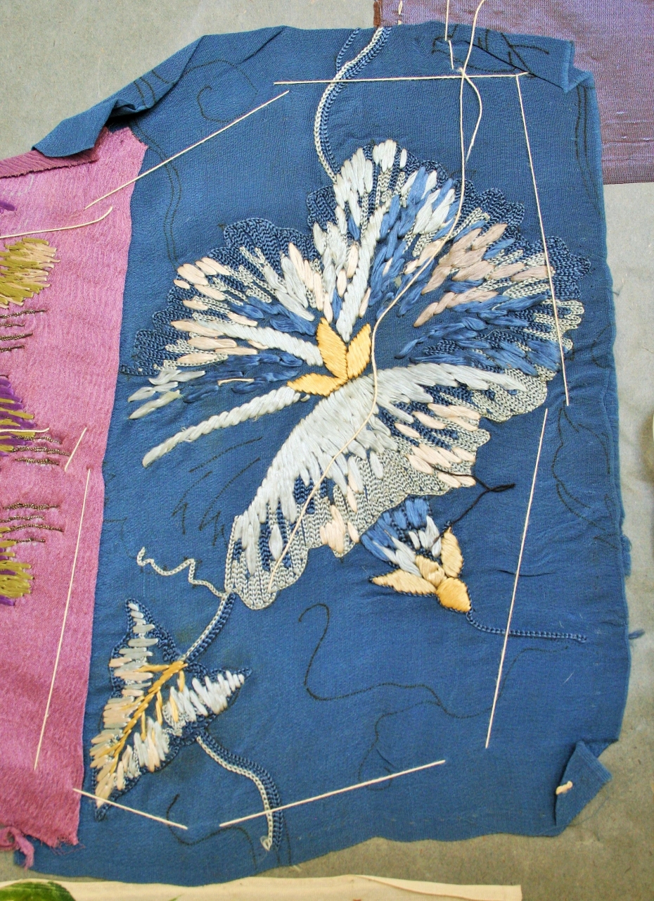 Frammento di tessuto crespo in seta bluette, ricamato a motivi floreali di medio rapporto con filati in sete policrome (tinta bluette, celeste, avorio, grigio e giallo paglierino; punti catenella à tambour, pieno, passato, sbieco, spaccato, raso). Presenti tracce del disegno preparatorio, ad inchiostro scuro