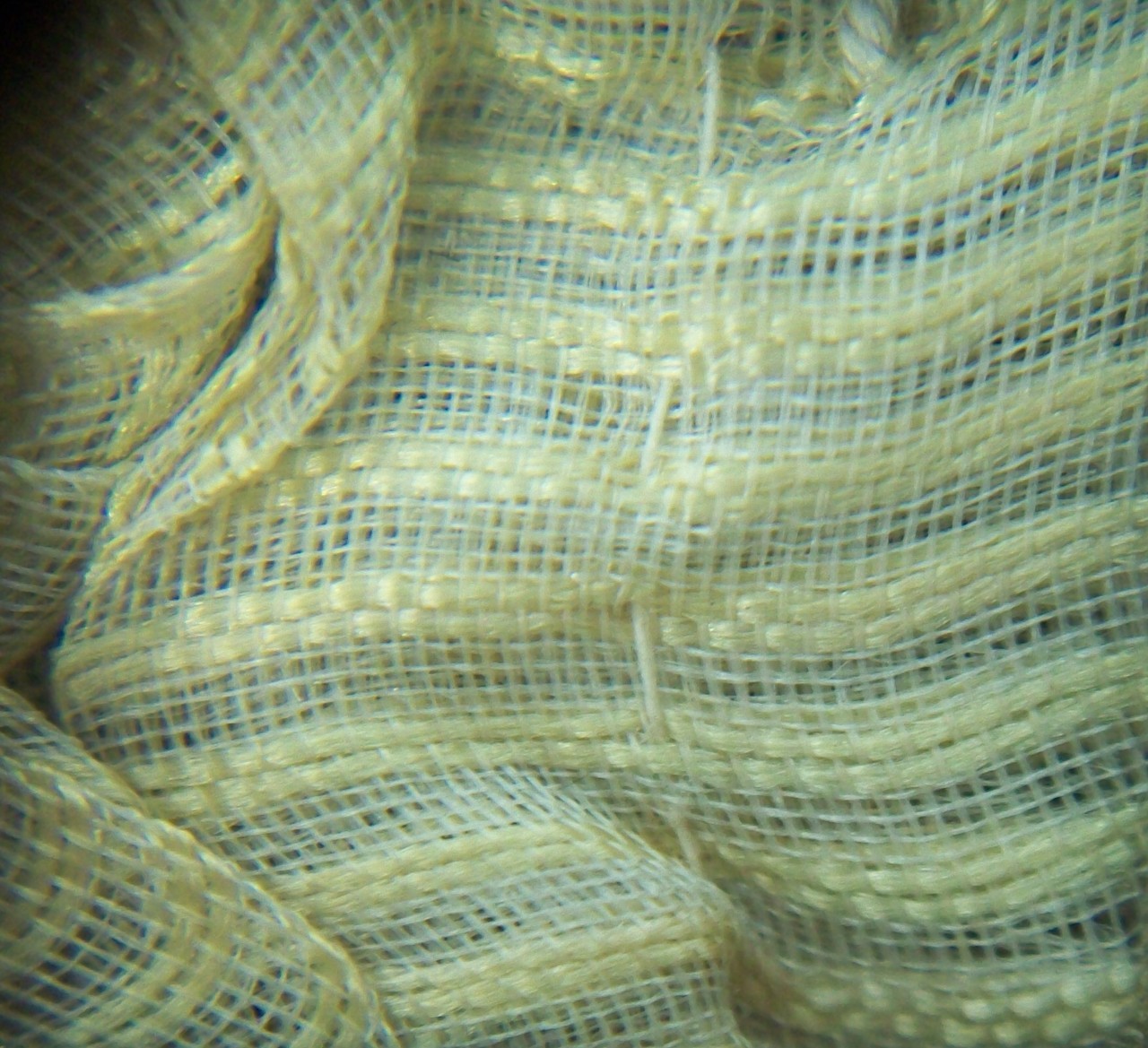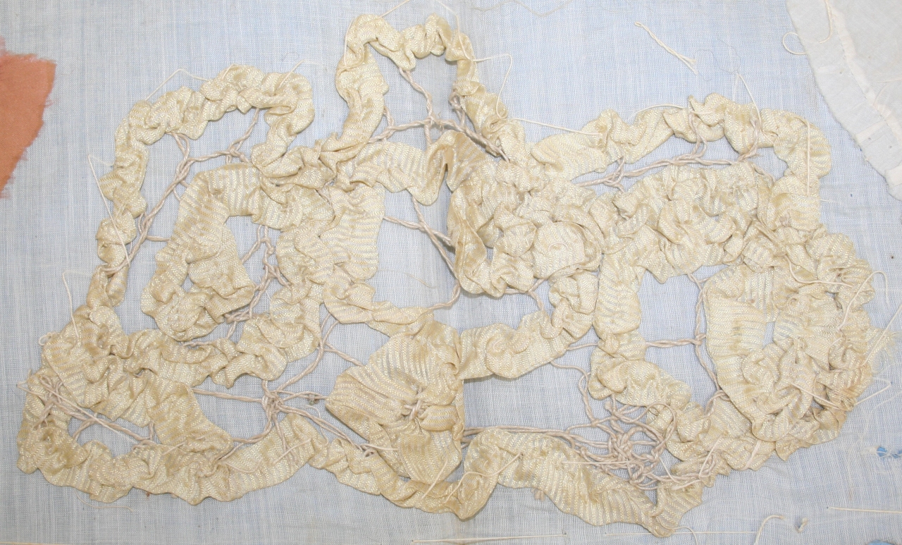 Guarnizione costituita da nastrino in chiffon di seta avorio fittamente increspato, operato per effetto di trame lanciate in seta giallo paglierino di diverso titolo, senza torsione apparente; barre di collegamento ad ago, in filato di cotone écru, a base di fili lanciati e ritorti