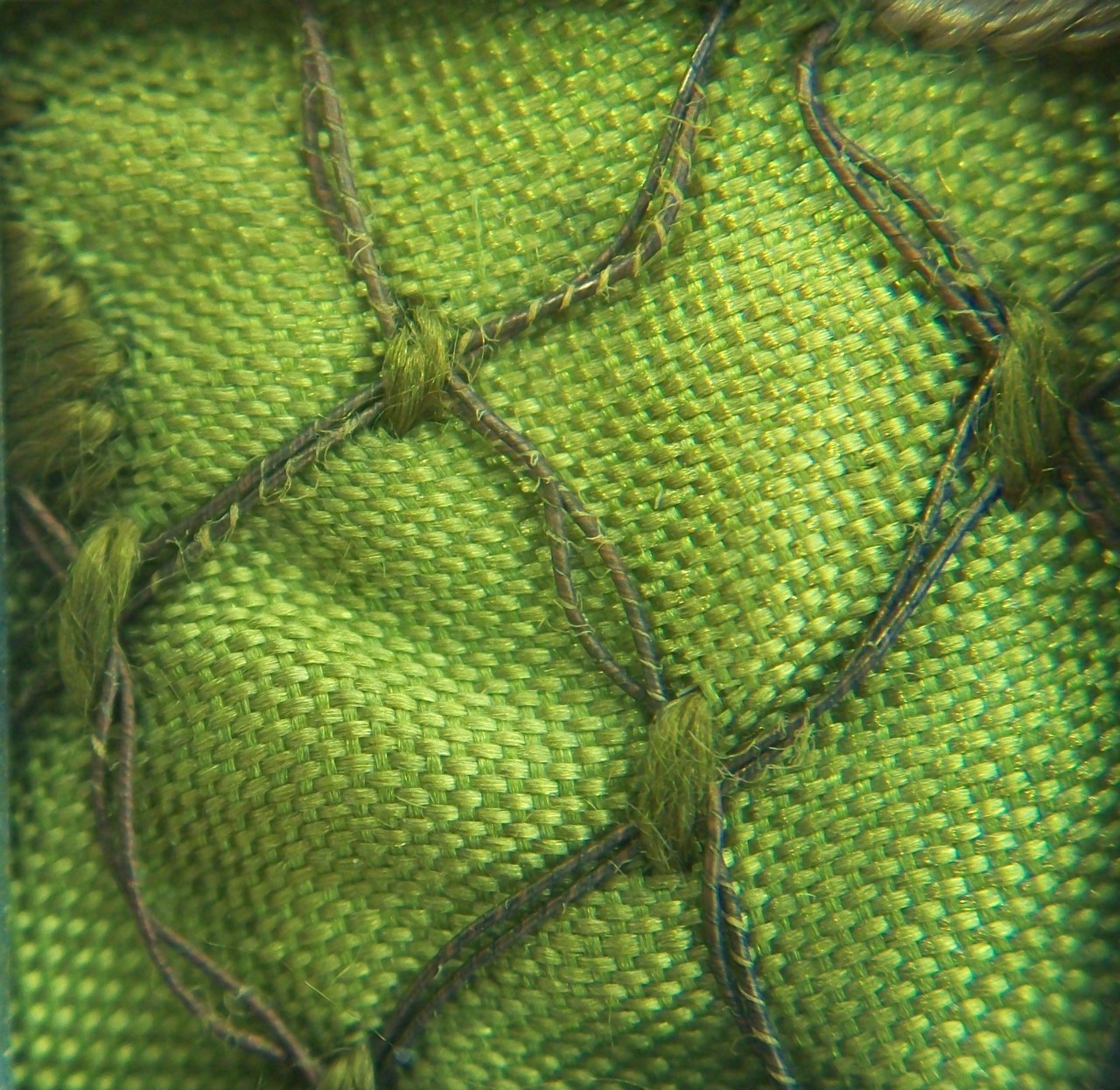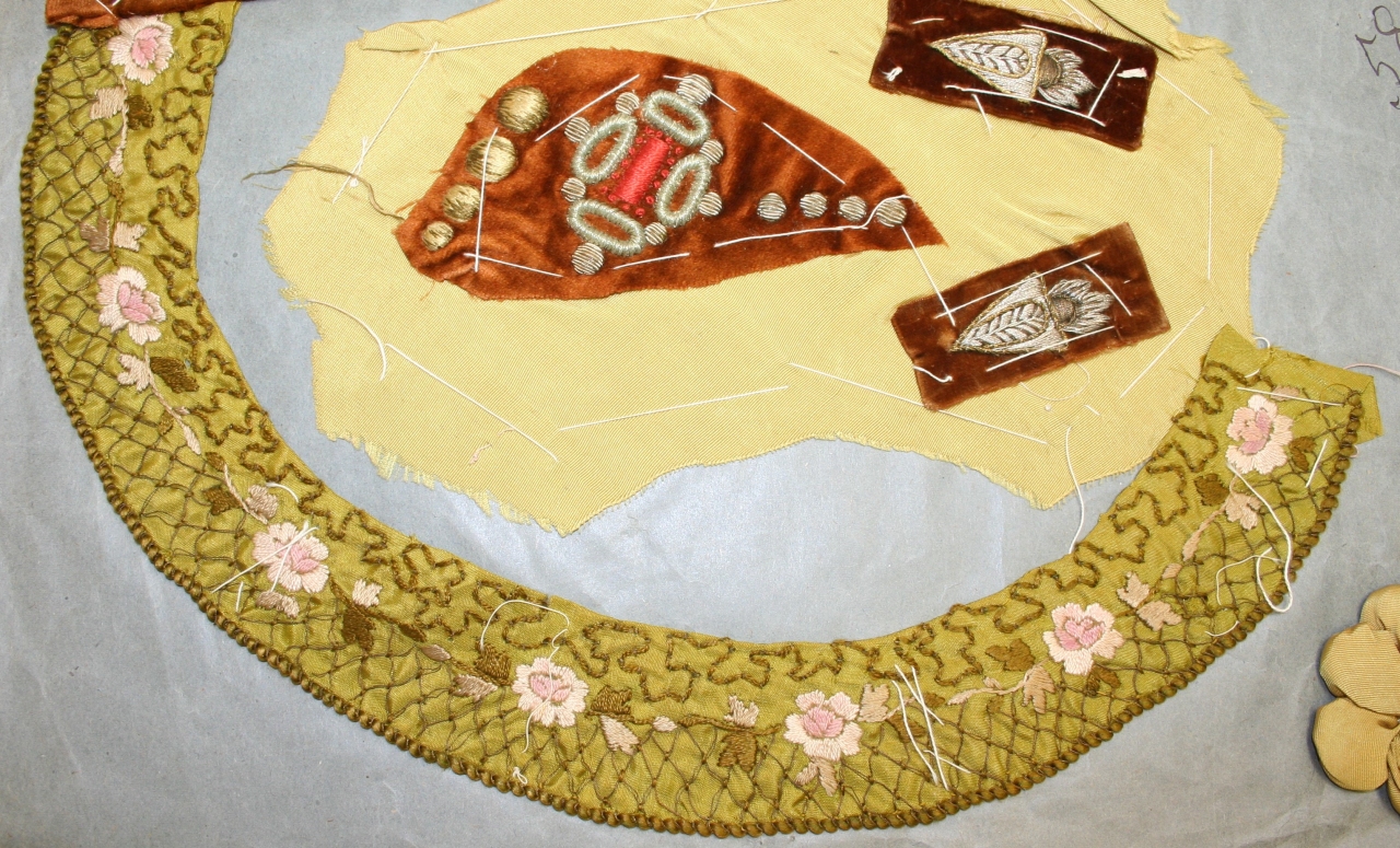 Scollo ricamato, per capo d'abbigliamento femminile, realizzato su base in taffetas di seta verde chiaro. Decoro con campiture a maglie romboidali in corrispondenza della parte esterna, e ad effetto vermicelles in quella interna, separate da teoria di roselline. Lavorazione a ricamo eseguita in filati di cotone (sulle tonalità del verde e del rosa), ed oro riant su anima gialla (punti posato, erba, passato, lanciati incrociati e fissati nei punti di tangenza da filato di cotone verde). Lungo l'orlo esterno, applicazione di cordoncino a torciglione in seta verde, su anima di cotone in tinta (punto posato, fissato in oro riant)
