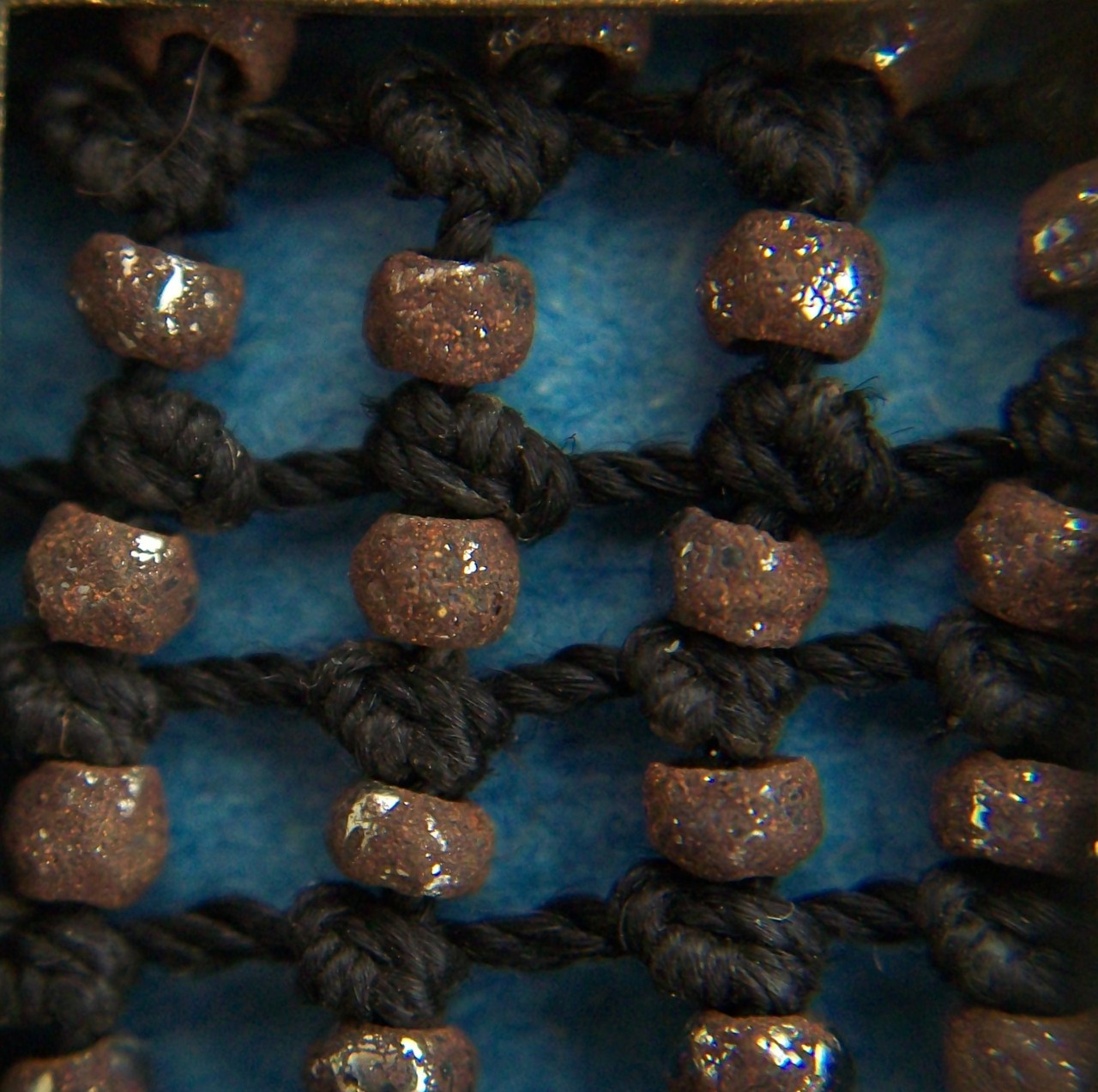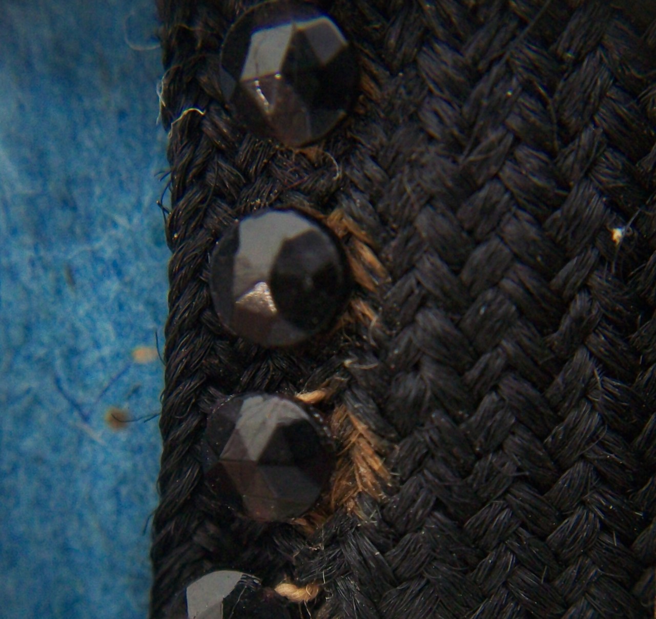 Tagli anteriori e dorso di corpino femminile (bolero). Ciascun taglio risulta profilato da cordoncino di cotone nero, sul quale sono fissate (manualmente, a cucito) larghe fasce in spighetta di seta misto lana (h cm 4), di colore nero (7 per il dorso, 8 per i tagli anteriori), disposte orizzontalmente, alternate a campiture lavorate a filet con doppia annodatura, in filato di cotone nero; tra la maglie, marcassiti argentate sfaccettate. Le fasce sono a loro volta profilate da file di jais, cannucce e borchie nere sfaccettate. Lungo l'apertura dei fianchi, le fasce sono ripiegate a formare asole (attraverso le quali, in origine, dovevano passare nastri o lacci). Lungo l'apertura anteriore, riscontrati ganci ed asole metalliche (una delle quali rivestita in filato di cotone nero, a punto occhiello)