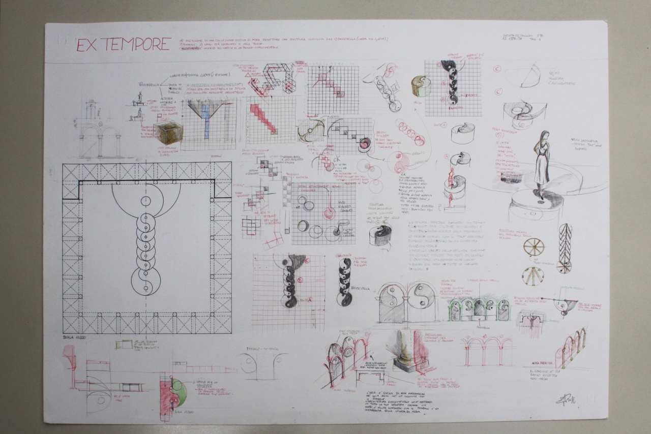 - NOTIZIE STORICO CRITICHE Il disegno rappresenta uno studio scenografico per una passerella di moda collocata in uno spazio storico, ovvero un cortile rinascimentale, e costituita da locali annessi per lo spogliatoio e per il trucco. L’opera fa parte del corso sperimentale di “Progettazione scenotecnica” dell’ex Istituto d’Arte di Porta Romana, che insegnava la progettazione della scena teatrale, considerando tutti i fattori legati alla scenografia, alla macchinistica, alla luministica, all’arredamento, alla costumistica e alla logistica del palcoscenico. Nel 1975 fu istituita la sezione di “Moda e Costume” come cattedra annessa alla sezione di “Tessitura” e, dieci anni dopo, nacque, come sezione sperimentale, quella di “Scenotecnica”. Successivamente, nel 1992, venne approvata dal Ministero dell’Istruzione, una sperimentazione nazionale e globale che andava ad affiancarsi ai tradizionali corsi di ordinamento (ovvero la “Sezione Sperimentale di Scenotecnica”). Il corso “Progettazione di scenotecnica” presso l’ex-Istituto, venne condotto, dal 1990 al 1997, dal Professore Giancarlo Mancini, che ne fu da subito il docente promotore