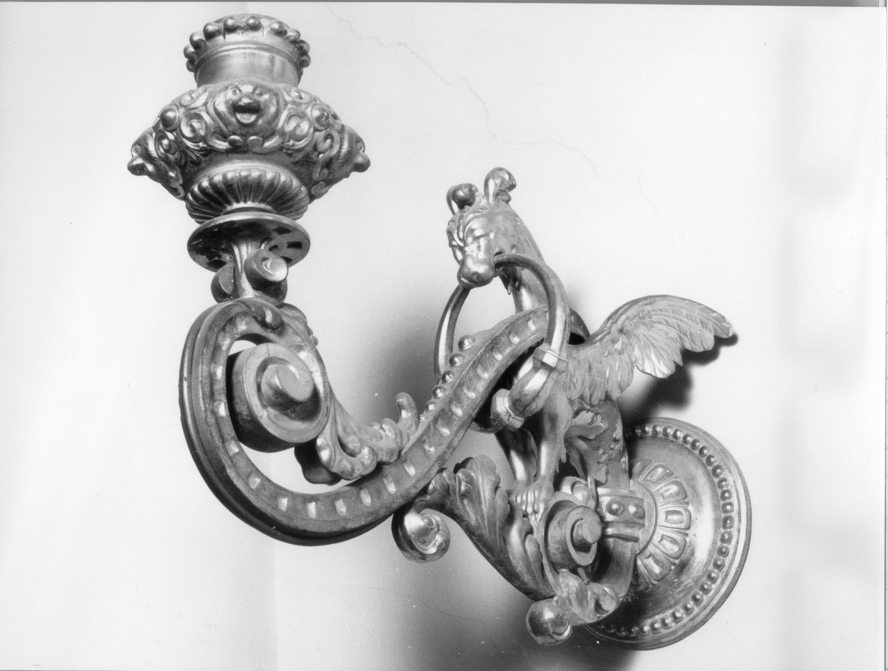 - NOTIZIE STORICO CRITICHE Reggilume composto da una borchia da fissarsi al muro da cui si stacca un drago che tiene stretta nella bocca una campanella, da cui fuooriesce una voluta che sostiene una coppa, corpo del lume. Il reggilume fa parte di una serie di quattro. Dai documenti (Giustificazioni Inventario Mobili 1863-1864, mandato n.6 del 1° aprile 1863) si apprende che la serie fu eseguita nel 1863 ca. dall'intagliatore Barbetti e dal doratore Bianchi. Solo nel 1921 i reggilumi furono disposti nel salone dove ancora oggi si trovano