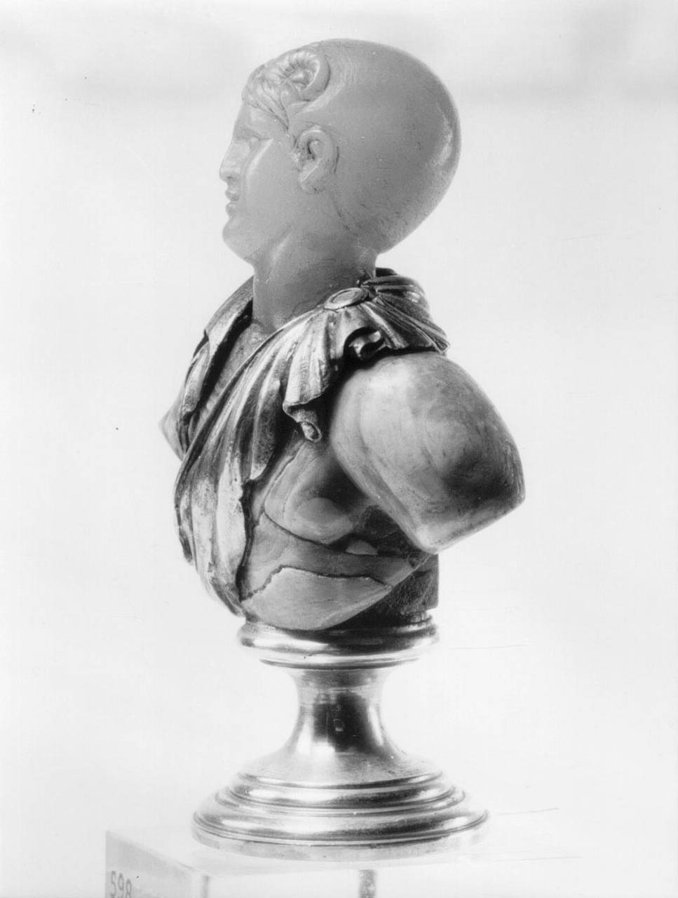 Testa e collo sono in calcedonio orientale; il busto è in alabastro orientale, la clamide in argento dorato e la base, circolare e modanata, è in metallo dorato