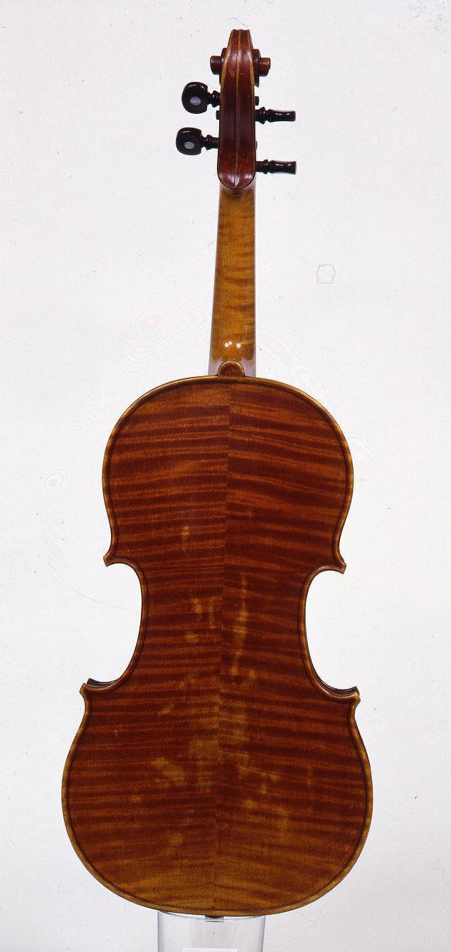 Tavola in due pezzi di abete a venatura media. Fondo in due pezzi di acero a marezzatura leggermente discendente dal centro; il fondo è ancorato per mezzo di un chiodino di fissaggio di legno infisso in corrispondenza dello zocchetto inferiore. Fasce di acero marezzato. Tavola e fondo filettati a tre fili. Manico in acero di fattura seriore con testa in acero, presumibilmente originale, innestata; gli spigoli della voluta sono evidenziati in nero. Tastiera moderna di ebano. Piroli moderni con semplici decorazioni intarsiate in madreperla. Ponticello marcato A. Del Lungo Firenze. Cordiera moderna con decorazione intarsiata in madreperla. Bottone moderno in alluminio con foro passante (probabilmente ideato per assicurare il posizionamento verticale dello strumento in esposizione). La vernice originale doveva apparire color giallo oro, ma su di essa è stata sovrapposta una vernice color rosso bruno. La vernice sulla tavola in basso a sinistra e a destra denuncia vistose tracce di mentoniera. La tavola presenta la punta inferiore della C di destra alquanto arrotondata e alcune fratture in basso ai lati del capotasto inferiore