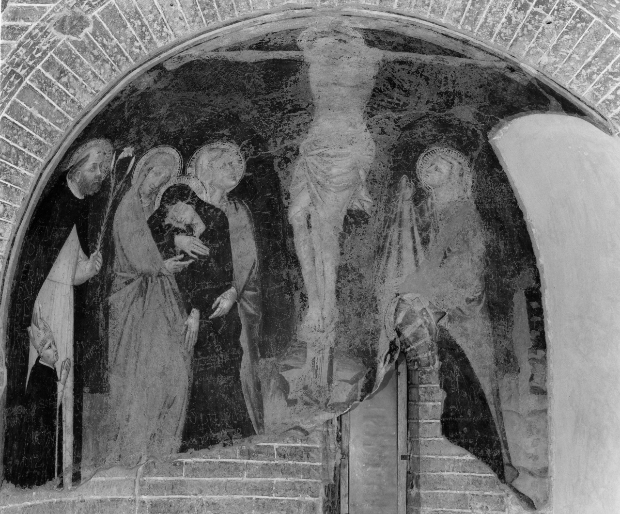 - NOTIZIE STORICO CRITICHE Nel dipinto, staccato e applicato su supporto per essere ricollocato nel suo luogo originario, ossia l'abside della cappella di S. Niccolò, è raffigurato Cristo crocifisso tra san Giovanni evangelista, la Madonna sorrettada santa Maria Maddalena e Maria di Cleofa, un santo vescovo inginocchiato, che potrebbe identificarsi con lo stesso Zeno, titolare della cattedraleo con lo stesso Niccolò, dedicatario della cappella, e san Domenico, cheintroduce la figura di un vescovo in preghiera, raffigurato di dimensionigerarchicamente minori, trattandosi del committente. Poichè questo personaggio con la mitria vescovile indossa il saio domenicano ed è introdotto dasan Domenico, si ritiene di poterlo identificare con Andrea Franchi, appunto frate domenicano e vescovo di Pistoia tra il 1381 e il 1400. L'identificazione circoscrive l'esecuzione dell'affresco a questo ventennio: stilisticamente esso può essere attribuito all'ambito di Giovanni di BartolomeoCristiani, pittore molto operoso a Pistoia, morto intorno al 1400, cui sideve anche la Crocifissione dipinta ad affresco nella sagrestia nuova di S. Jacopo